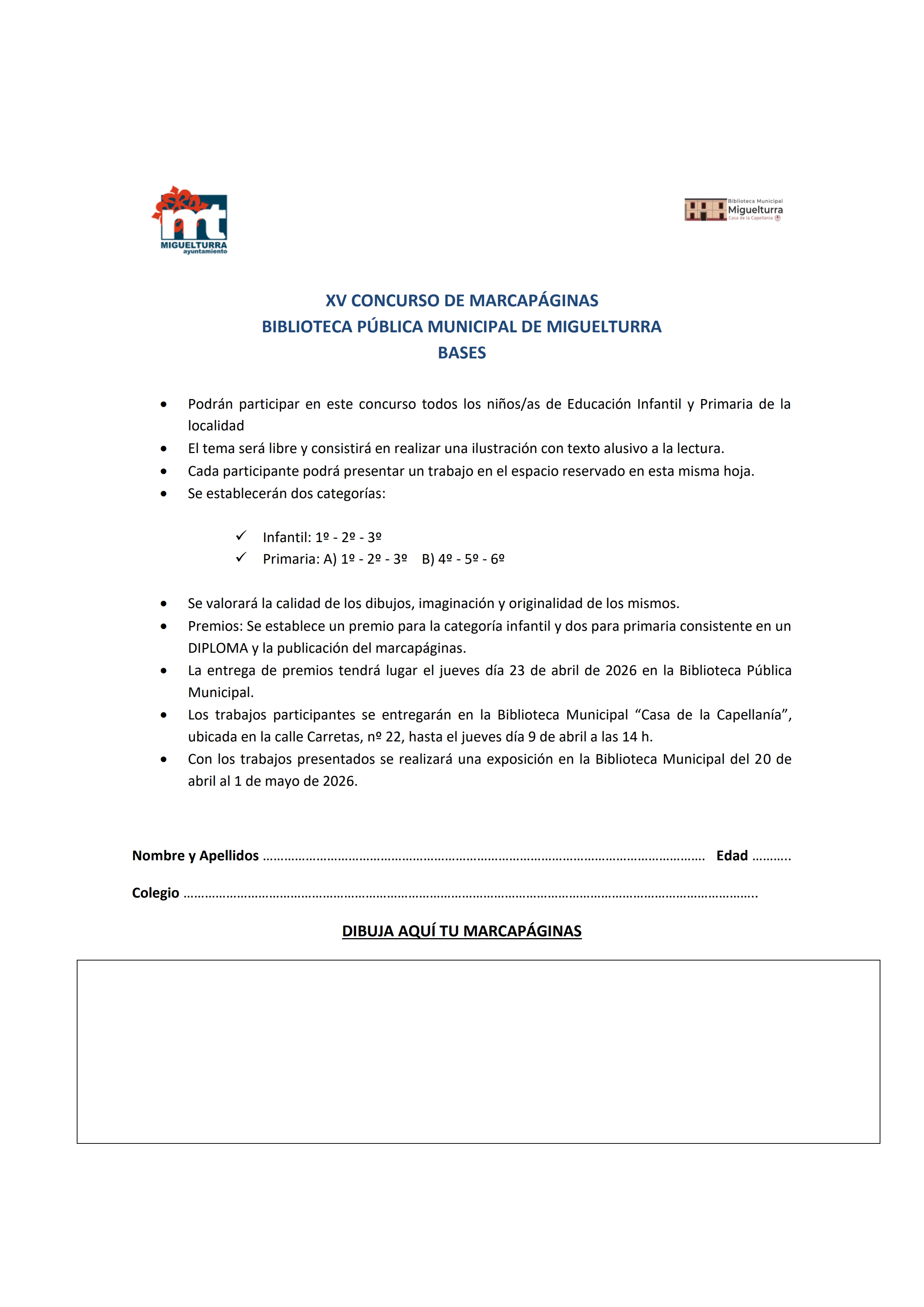 La Biblioteca Municipal "Casa de la Capellanía", dependiente del área de Cultura del Ayuntamiento, ha dado a conocer las bases que rigen la decimoquinta edición del concurso de marcapáginas con motivo del Día del Libro 2026, cuyo plazo estará abierto hasta el jueves 9 de abril de 2026.