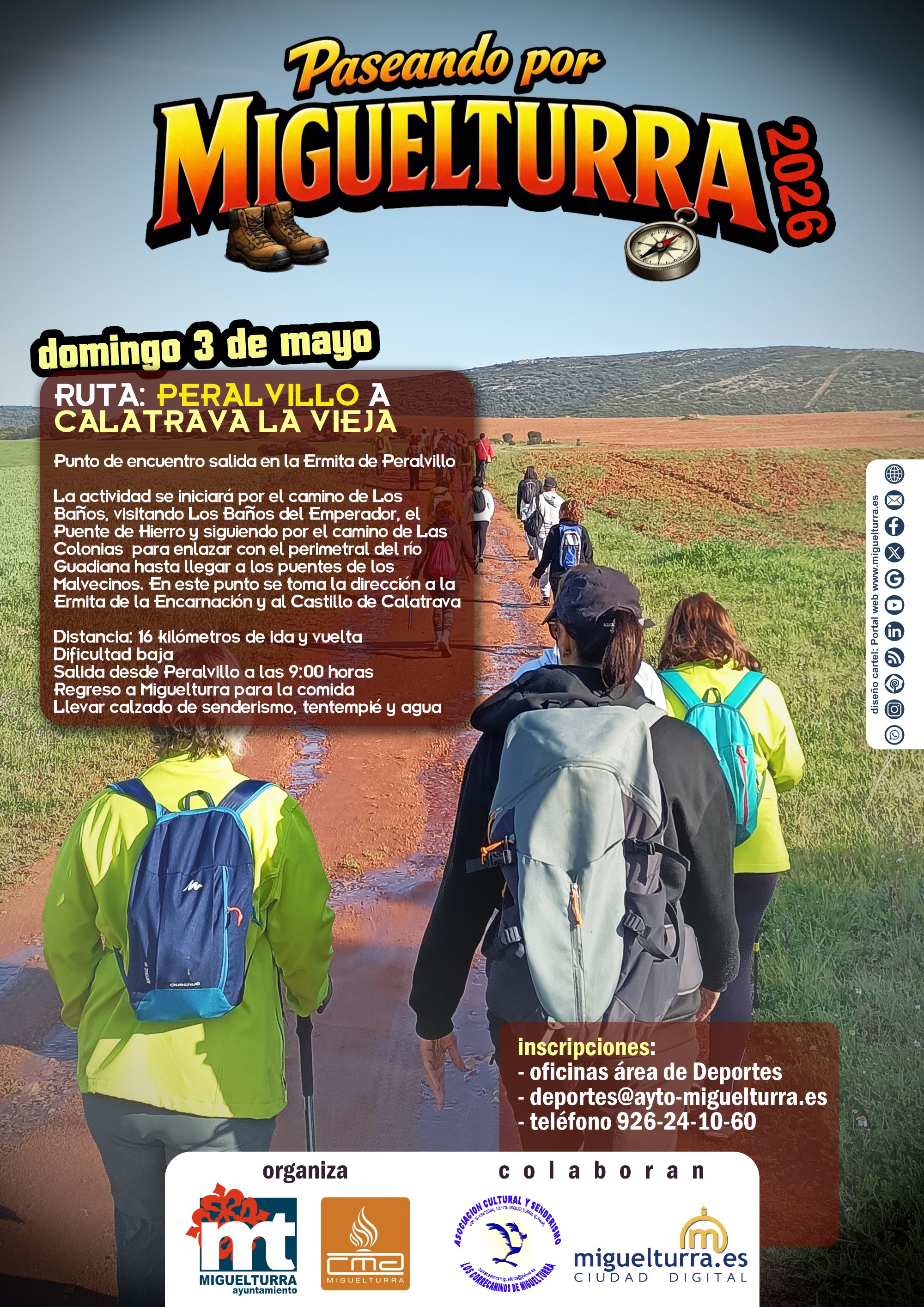 El área de Deportes informa que desde estas fechas está abierto el plazo para inscribirse en una nueva ruta dentro de “Paseando por Miguelturra”, y que esta primera ruta del año 2026 se realizará el domingo 3 de mayo de Peralvillo a Calatrava la Vieja y vuelta a partir de las 9 de la mañana, en este evento colaboran la Asociación Cultural y de Senderismo “Los Correcaminos de Miguelturra” y nuestro portal web municipal www.miguelturra.es, y que en este evento hemos actualizado el anagrama de “Paseando por Miguelturra”, que usamos al hacer la cartelería.