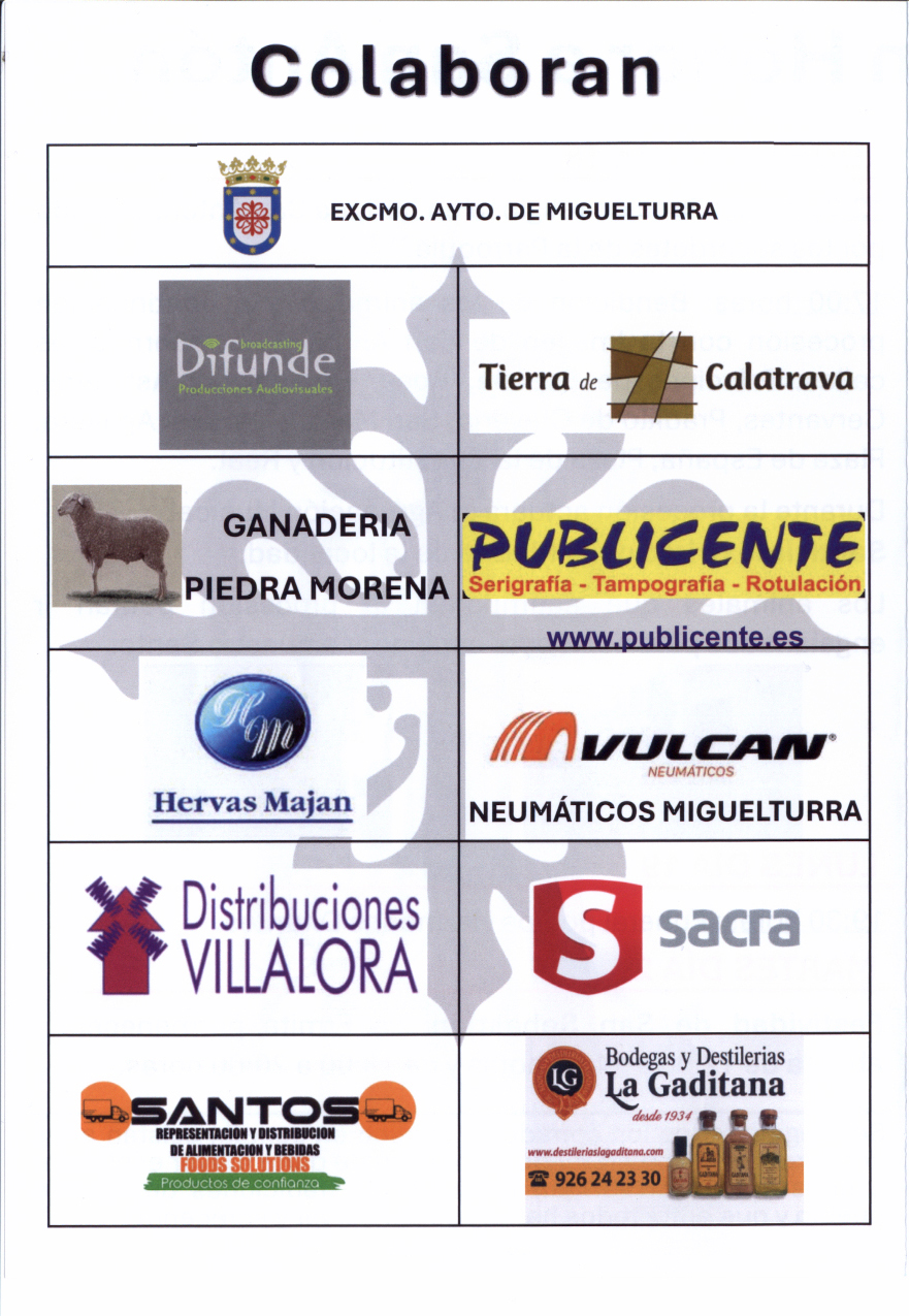 La realización de los eventos en honor a San Antón 2026 es posible gracias al invaluable apoyo de una serie de colaboradores destacados, Ayuntamiento de Miguelturra, Difunde - Producciones Audiovisuales, Tierra de Calatrava, Ganadería Piedra Morena, Publicente - Serigrafía - Tampografía - Rotulación, Distribuidora Hervas Maján, VULCAN Neumáticos Miguelturra, Distribuciones Villalora, Distribuciones Sacra, SANTOS - Representación y Distribución de Alimentación y Bebidas y Destilerías La Gaditana desde 1934: a todos ellos, nuestro más sincero agradecimiento por hacer posible esta celebración.