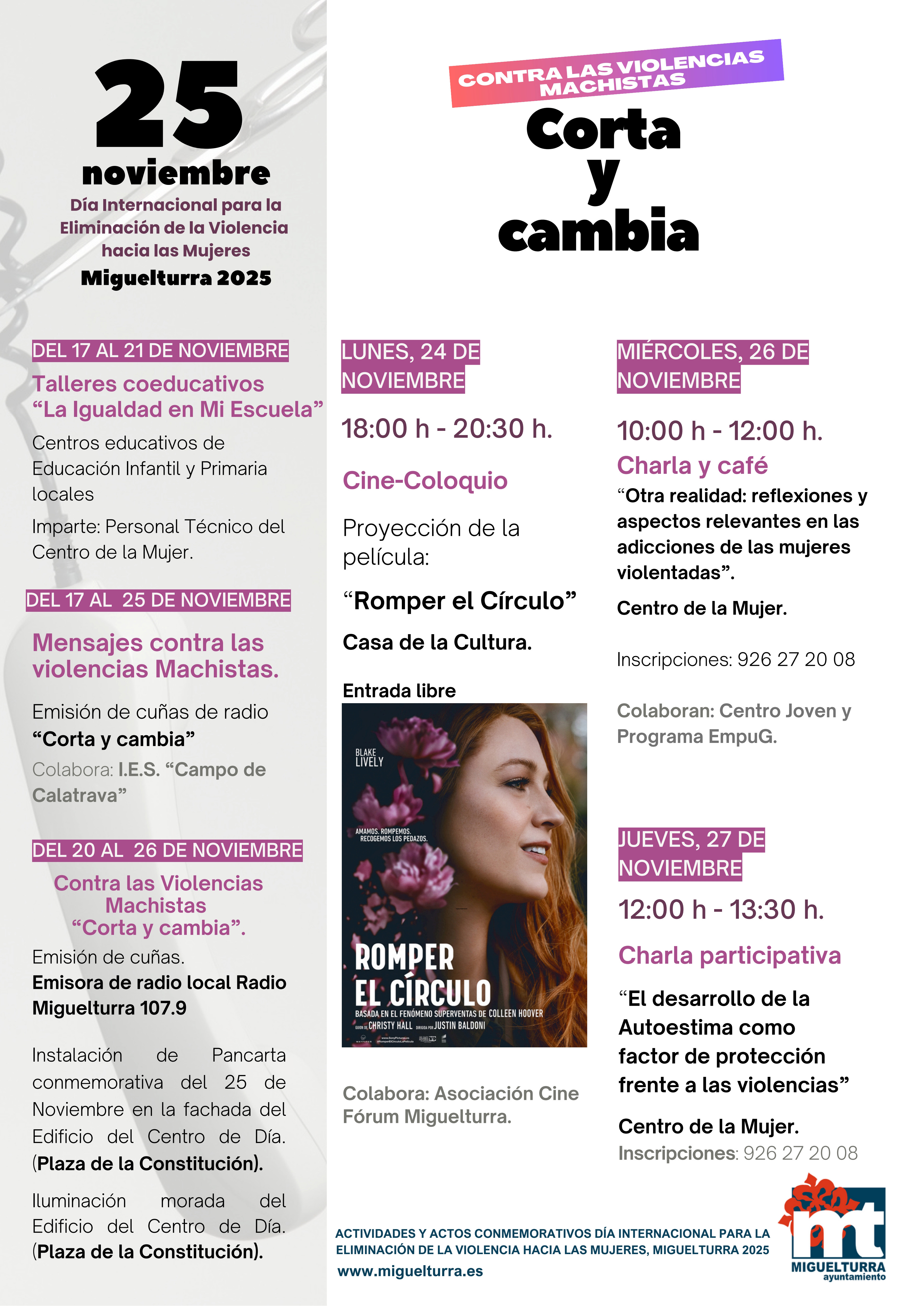 - Lunes 24 de noviembre (18:00 h): Cine-coloquio en la Casa de la Cultura con la proyección de la película “Romper el Círculo”, en colaboración con la Asociación Cine Fórum Miguelturra.