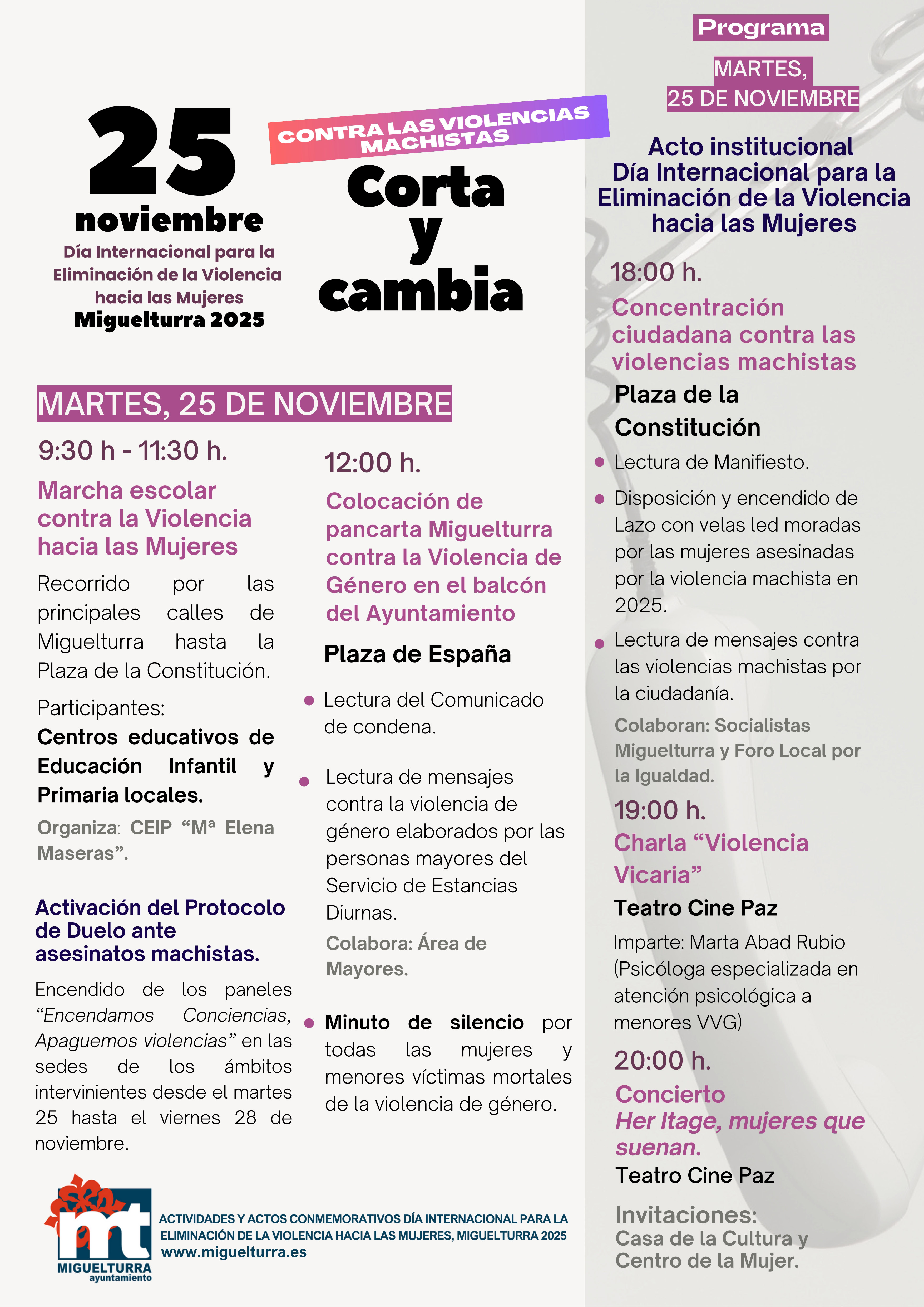 El martes 25 de noviembre concentrará los actos principales. La jornada comenzará a las 9:30 h con una marcha escolar contra la violencia machista, organizada por el CEIP Mª Elena Maseras y con la participación de todos los centros educativos de infantil y primaria.
