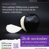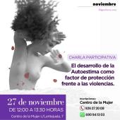 Miércoles 26 de noviembre (10:00 h): Charla-café en el Centro de la Mujer sobre las adicciones en mujeres violentadas. - Jueves 27 de noviembre (12:00 h): Charla participativa sobre la autoestima como factor de protección, impartida en el Centro de la Mujer (inscripciones abiertas).