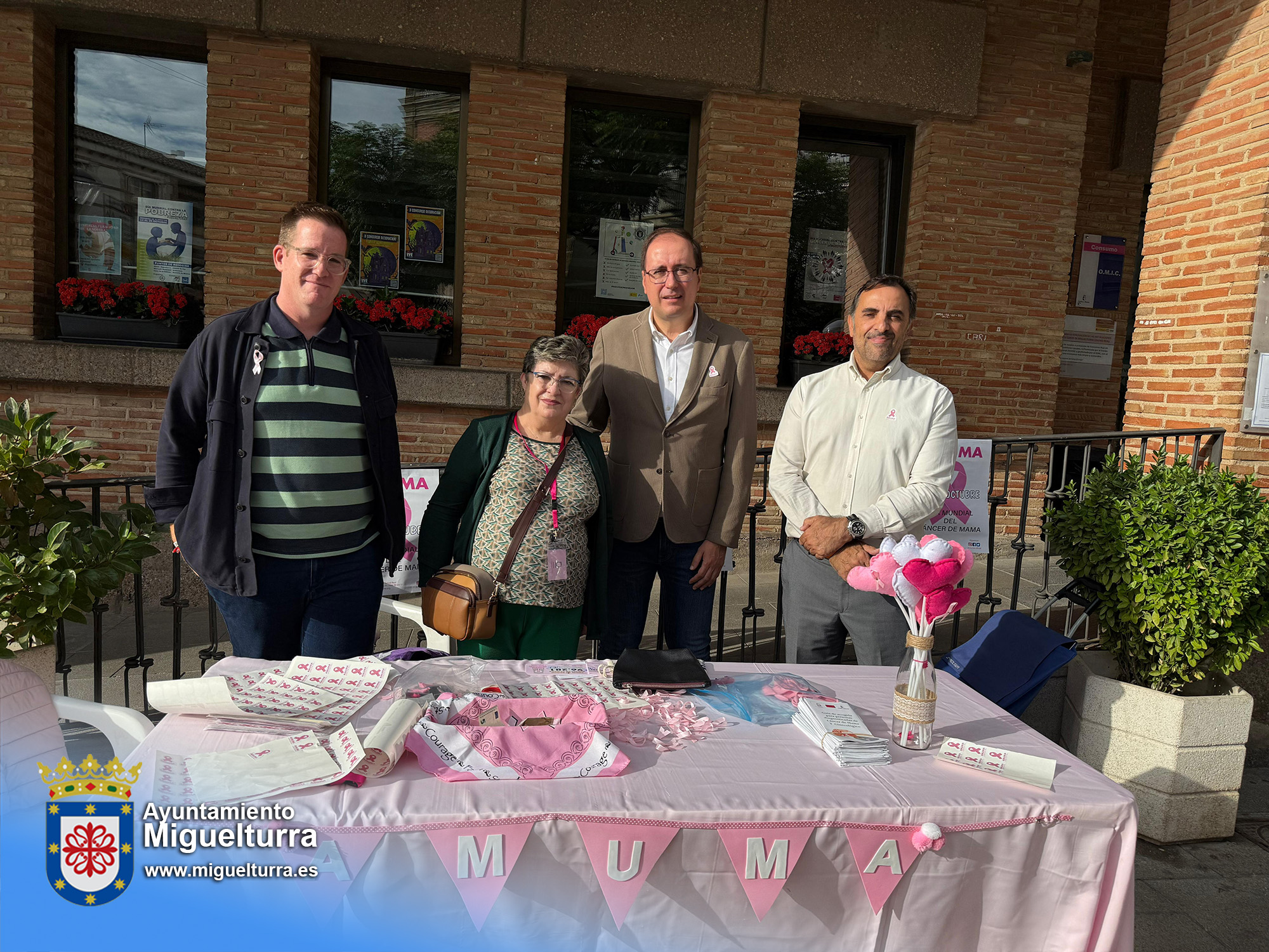 Con motivo del Día Internacional de la Lucha contra el Cáncer de Mama, el alcalde de Miguelturra, Luis Ramón Mohíno, ha querido mostrar el respaldo absoluto del Ayuntamiento a esta causa, visitando la mesa petitoria que la Asociación de Cáncer de Mama y Ginecológico de Castilla-La Mancha (AMUMA) ha instalado en las puertas del Consistorio para recaudar fondos.