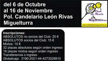 Del 6 de octubre al 16 de noviembre. Organizado por el Club de Tenis de Miguelturra en colaboración con el área de Deportes del Ayuntamiento. Inscripciones abiertas hasta fin de septiembre.