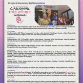 • Lunes 16 de febrero: La tradicional "Fruta en Sartén" con la Peña Los Rocheros y, por la tarde, el concurso de mascotas "Dejando Huella" (Peña Kapikúa) y la concentración de Máscaras Callejeras.
