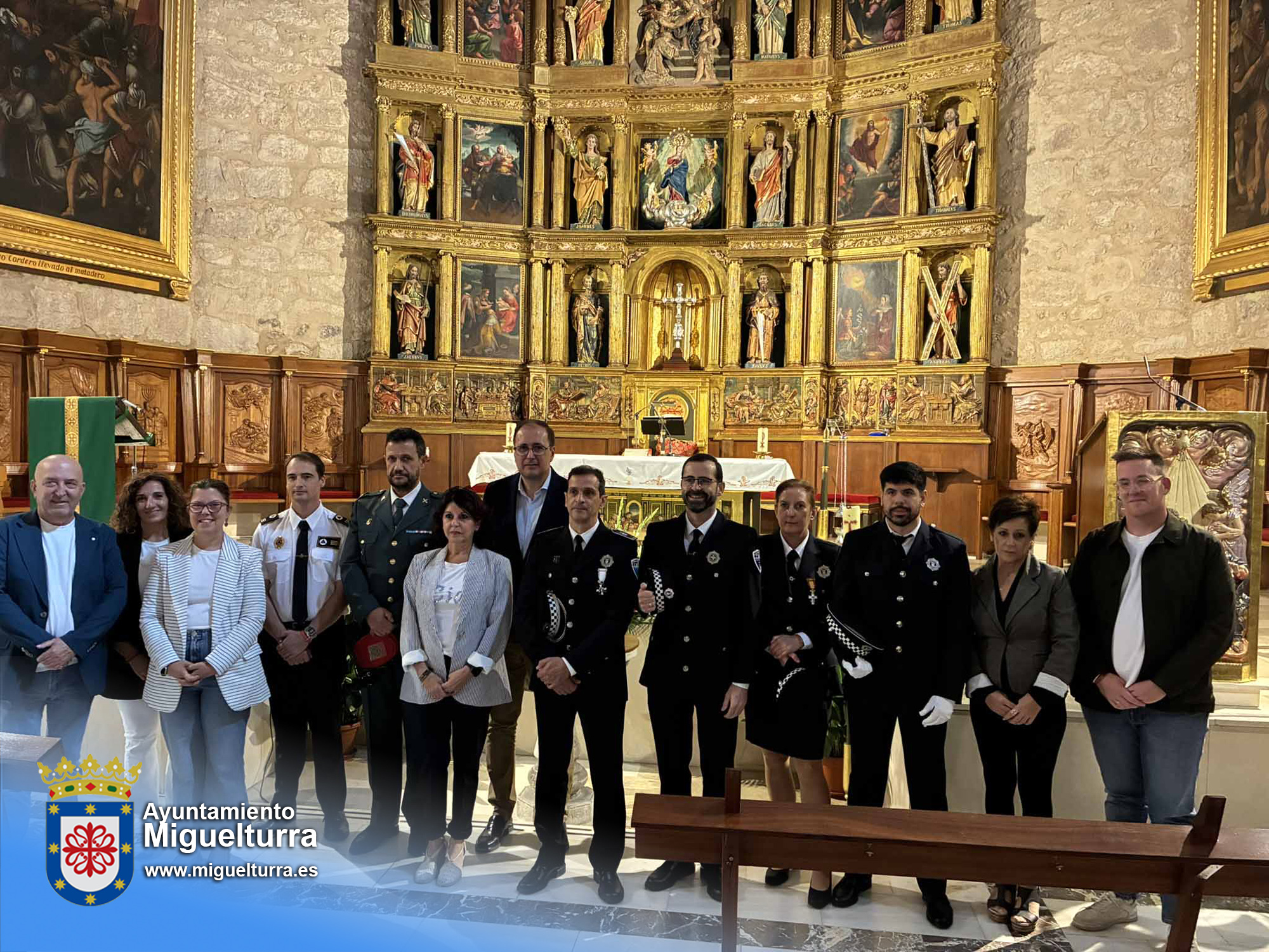 El Ayuntamiento de Miguelturra ha celebrado hoy el día de los Santos Ángeles Custodios, patronos de la Policía Local, con una solemne misa en la Parroquia Nuestra Señora de la Asunción, seguida de un acto de reconocimiento a la labor de los agentes que velan por la seguridad de la ciudadanía. El alcalde, Luis Ramón Mohíno, y la concejala de Seguridad Ciudadana, Nieves Almansa, han presidido el evento para poner en valor el trabajo diario y el compromiso del cuerpo en el que han estado presentes también el sargento de la Guardia Civil, Ángel Luis Hormigos; Juan José Martín oficial jefe en funciones de la policía local y jefe de protección Civil, Juan Manuel Hernández y los miembros de corporación municipal.