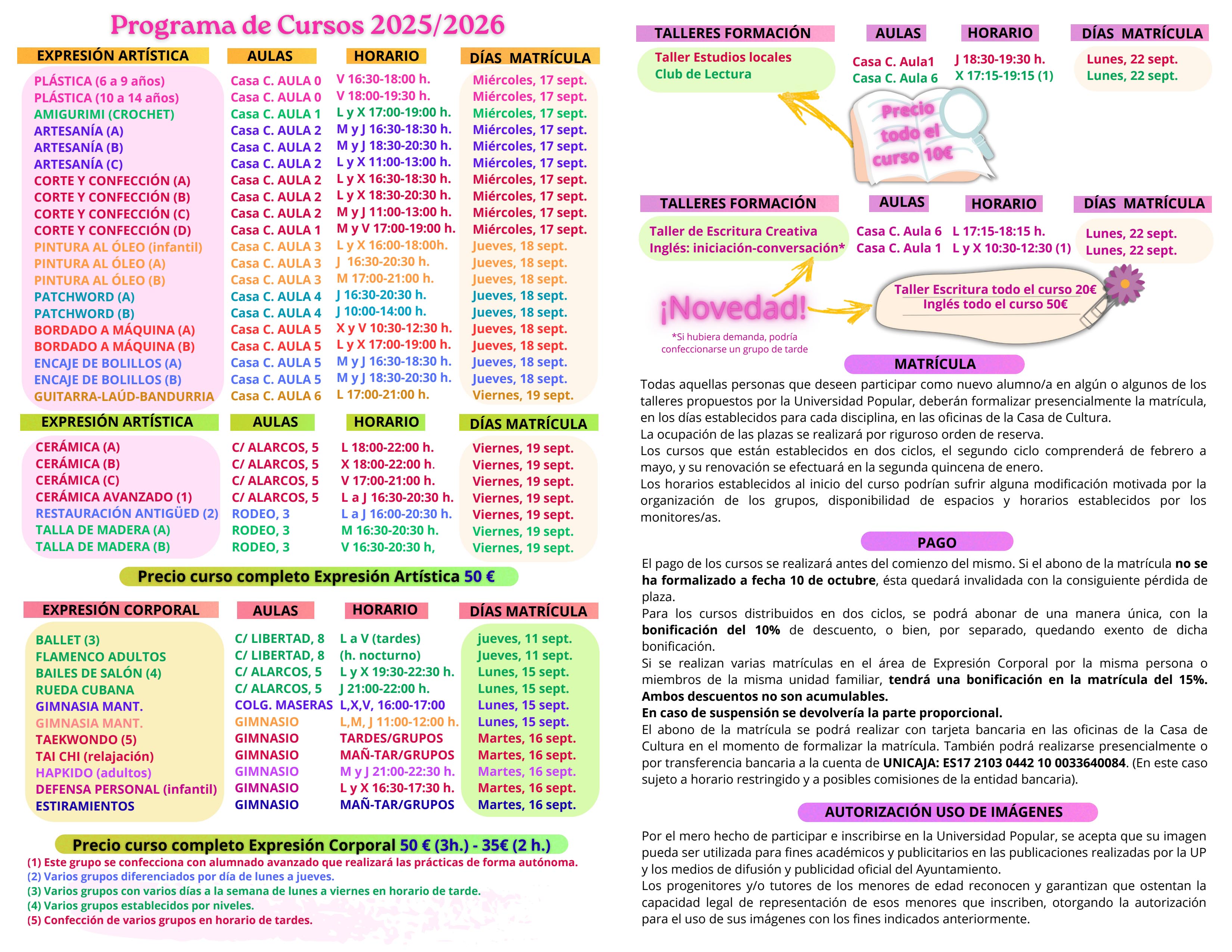 El periodo de matriculación para el nuevo curso comenzará el jueves 11 de septiembre. Toda la información detallada sobre los cursos, horarios y plazos de inscripción se encuentra disponible en el folleto oficial de la Universidad Popular.