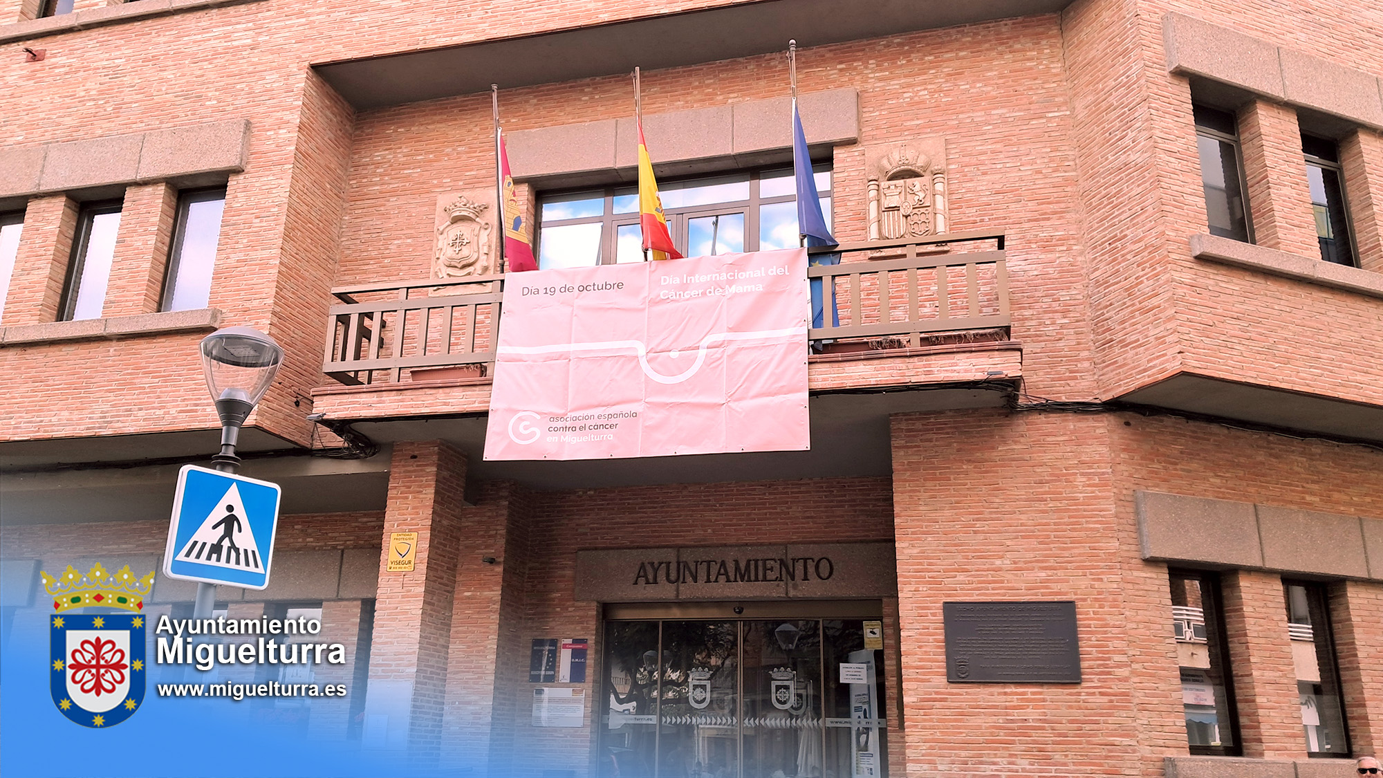 Como es tradición, el Ayuntamiento de Miguelturra ha colgado, un año más, la pancarta conmemorativa con motivo del Día Internacional de la Lucha contra el Cáncer de Mama, que se celebra cada 19 de octubre. Este gesto simbólico muestra el apoyo y la solidaridad de toda la Corporación Municipal y del pueblo de Miguelturra con las personas que luchan o han luchado contra esta enfermedad, así como con sus familias.