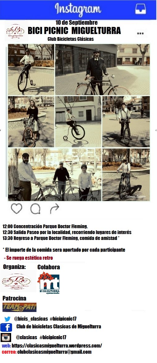 La Asociación Bicis Clásicas en colaboración con el Ayuntamiento de Miguelturra ha programado dentro de las Ferias y Fiestas 2017 de Miguelturra la quinta edición de la "Bici Picnic Vintage", en el que se invita a todas las personas que tengan una bicicleta antigua y se vistan de época o con ropa muy antigua para unirse en un recorrido por las calles de la localidad y hablar sobre otras épocas en la que la bicicleta era la reina de los medios de locomoción.