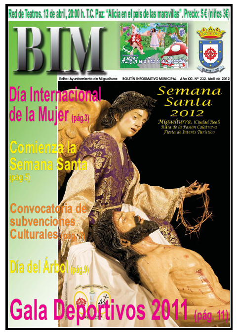 Desde estas fechas ya está disponible el Boletín Informativo Municipal, más conocido como BIM, en el portal web www.miguelturra.es, página oficial del Ayuntamiento de Miguelturra, periódico que refleja las noticias más relevantes que se han publicado en los medios de comunicación locales, además de zonas de opinión general, imágenes del recuerdo, entre otros temas.