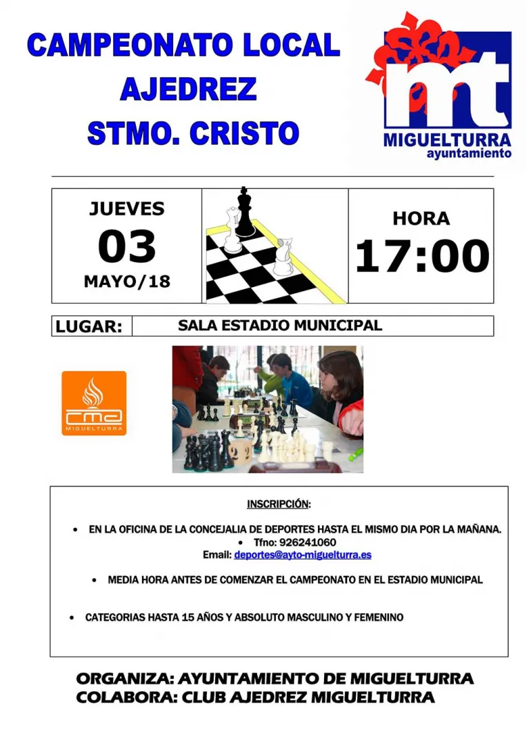 Campeonato Local de Ajedrez Santísimo Cristo. Sala del Estadio Municipal de Deportes a las 17:00 horas. Inscripciones abiertas.