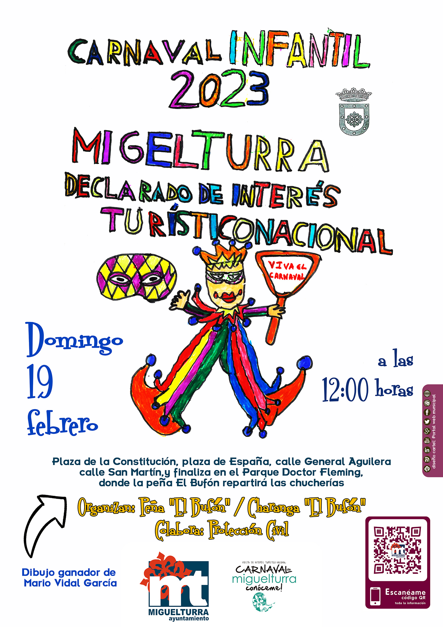 El domingo 19 de febrero a las 12 de la mañana, y dentro de la programación del Carnaval de Miguelturra 2023, serán la Peña "Bufón" y la charanga "El Bufón", las encargadas de hacer pasar a los niños y niñas un día inolvidable en este día señalado del Carnaval Infantil, en colaboración con la Agrupación de Voluntarios de Protección Civil.