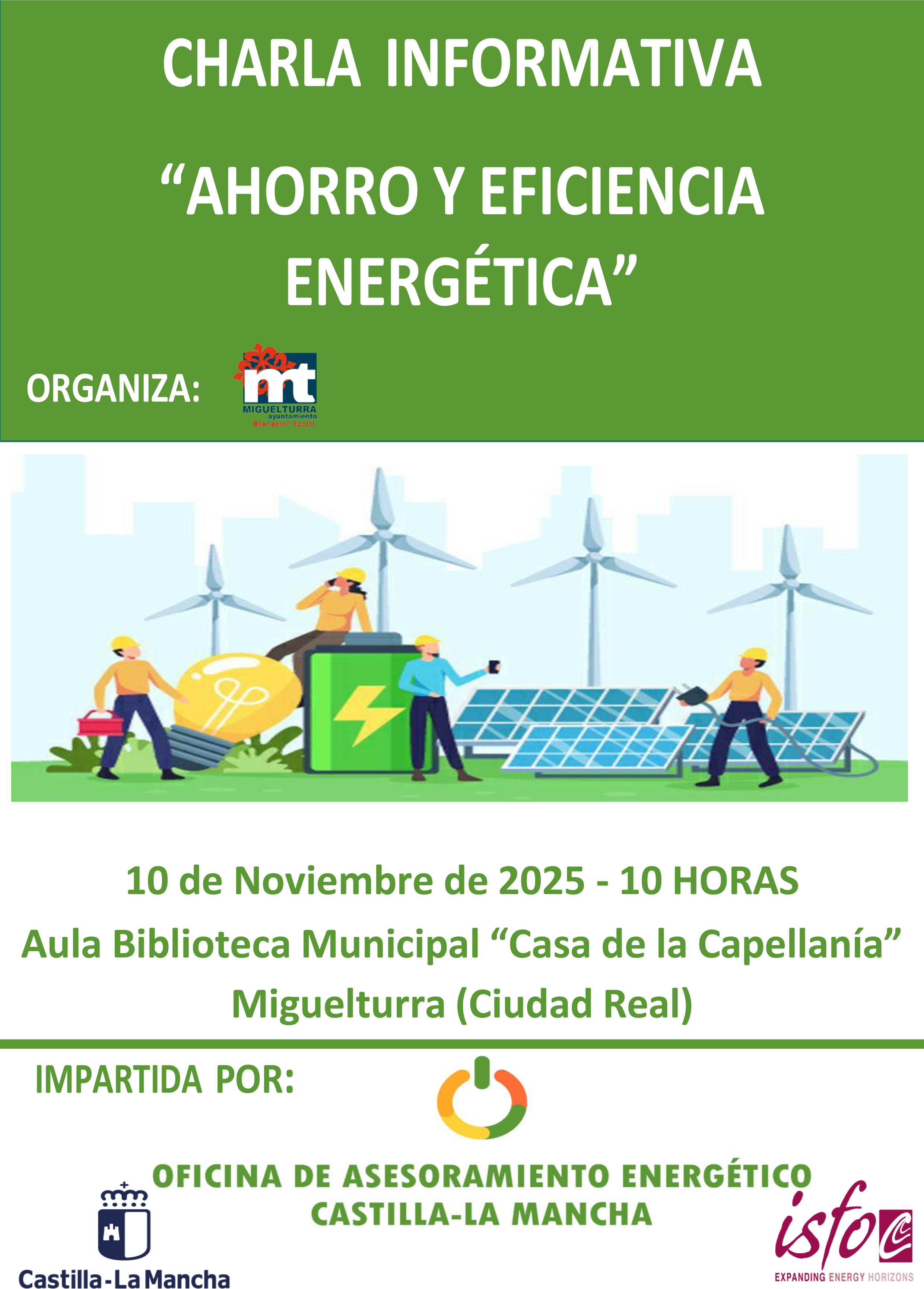 Desde el área de Bienestar Social informan de la charla informativa "Ahorro y eficiencia energética" que tendrá lugar el próximo lunes, día 10 de noviembre de 2025 a las 10:00 horas en el Aula de la Biblioteca Municipal "Casa de la capellanía", con una duración aproximada de 45 minutos y que está impartida por la Oficina de Asesoramiento Energético de Castilla-La Mancha.
