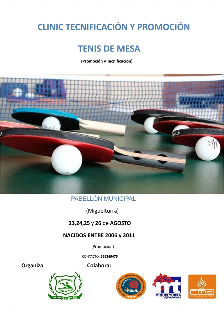 Dentro de las actividades de verano que se van a desarrollar en Miguelturra, en los que colabora el área de Deportes del consistorio, el Club de Tenis de Mesa Miguelturra pondrá en marcha un clinic de tenis de mesa para niveles iniciación y tecnificación.