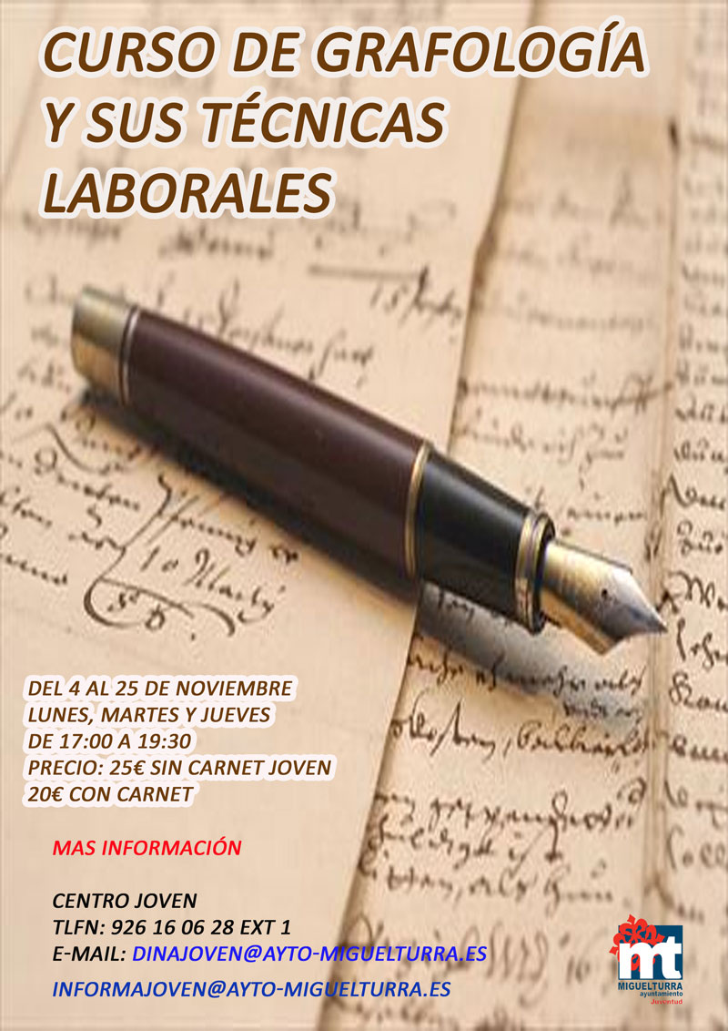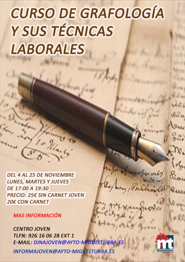 El CentroJoven, dependiente del Área de Juventud del Ayuntamiento de Miguelturra, informa sobre el comienzo de inscripciones para participar en el curso de grafología y sus técnicas laborales que se impartirá del 4 al 25 de noviembre.