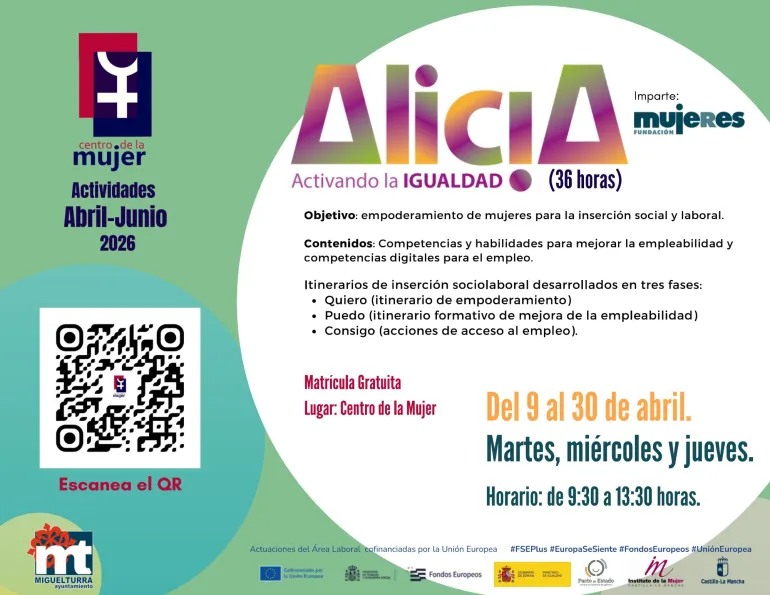 Dentro de la programación del área de Igualdad les damos a conocer el taller/curso "Activando la igualdad, Alicia", impartido por Mujeres Fundación, de 36 horas.