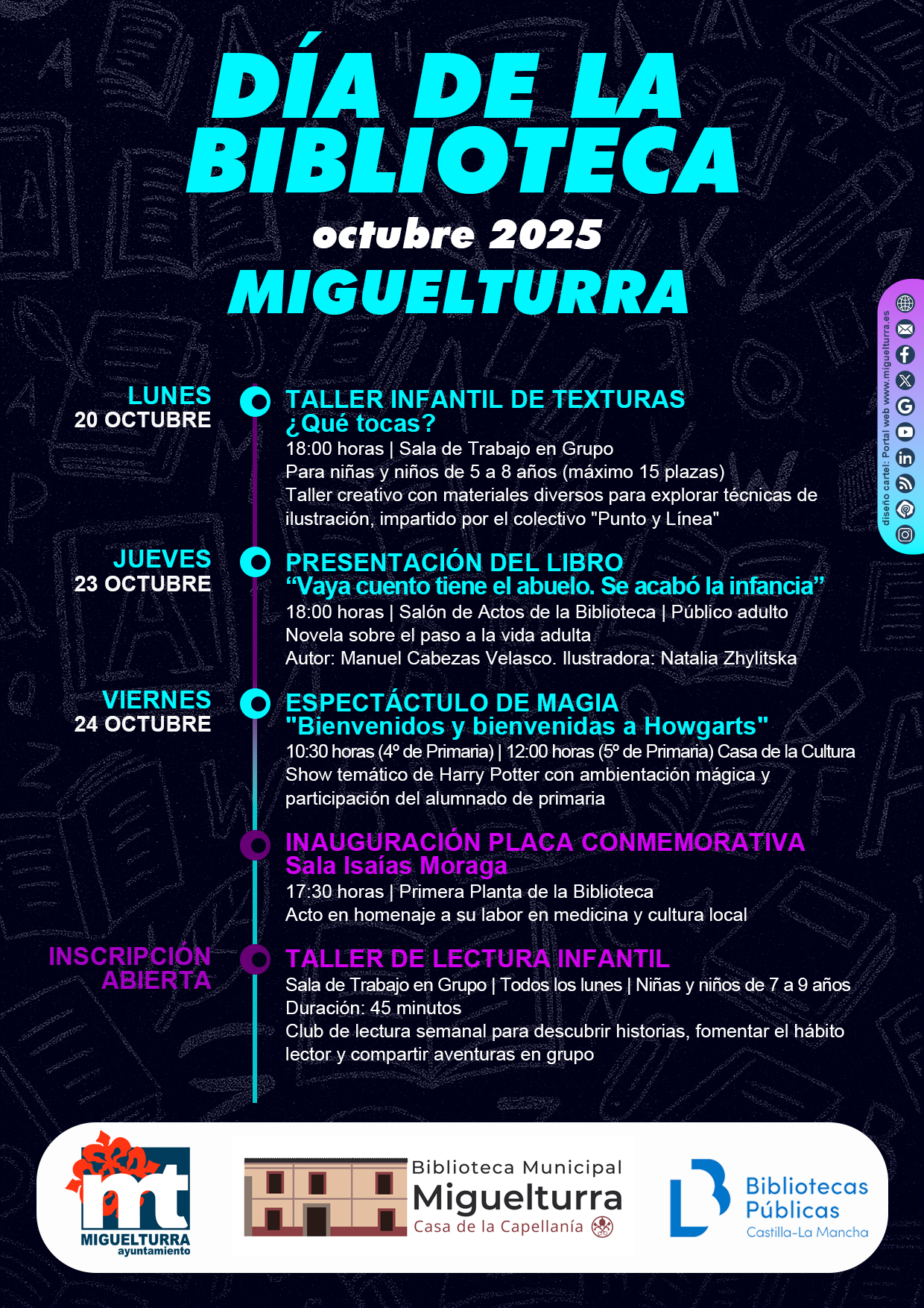 La Biblioteca Municipal Casa de la Capellanía, dependiente del área de Cultura del Ayuntamiento de Miguelturra, conmemora el Día de la Biblioteca 2025 con una completa programación de actividades para todos los públicos, que se desarrollarán entre los días 20 y 24 de octubre.
