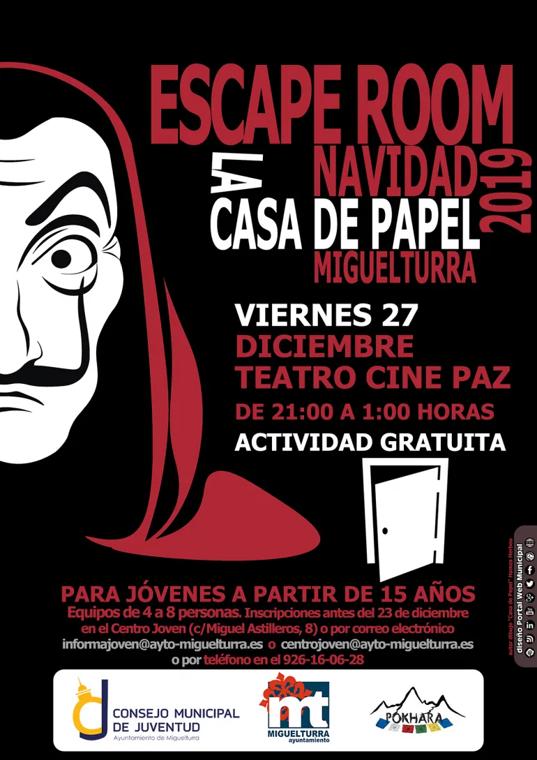 El área de Juventud del Ayuntamiento abre desde estas fechas y hasta antes del 23 de diciembre el plazo para poder inscribirse para participar en una edición especial y escape room "La Casa de Papel", organizado por Consejo Municipal de Juventud y Asociación Pokhara en colaboración con el consistorio, que se celebrará el viernes 27 de diciembre en el Teatro Cine Paz de 21:00 a 1:00 horas y gratuito.