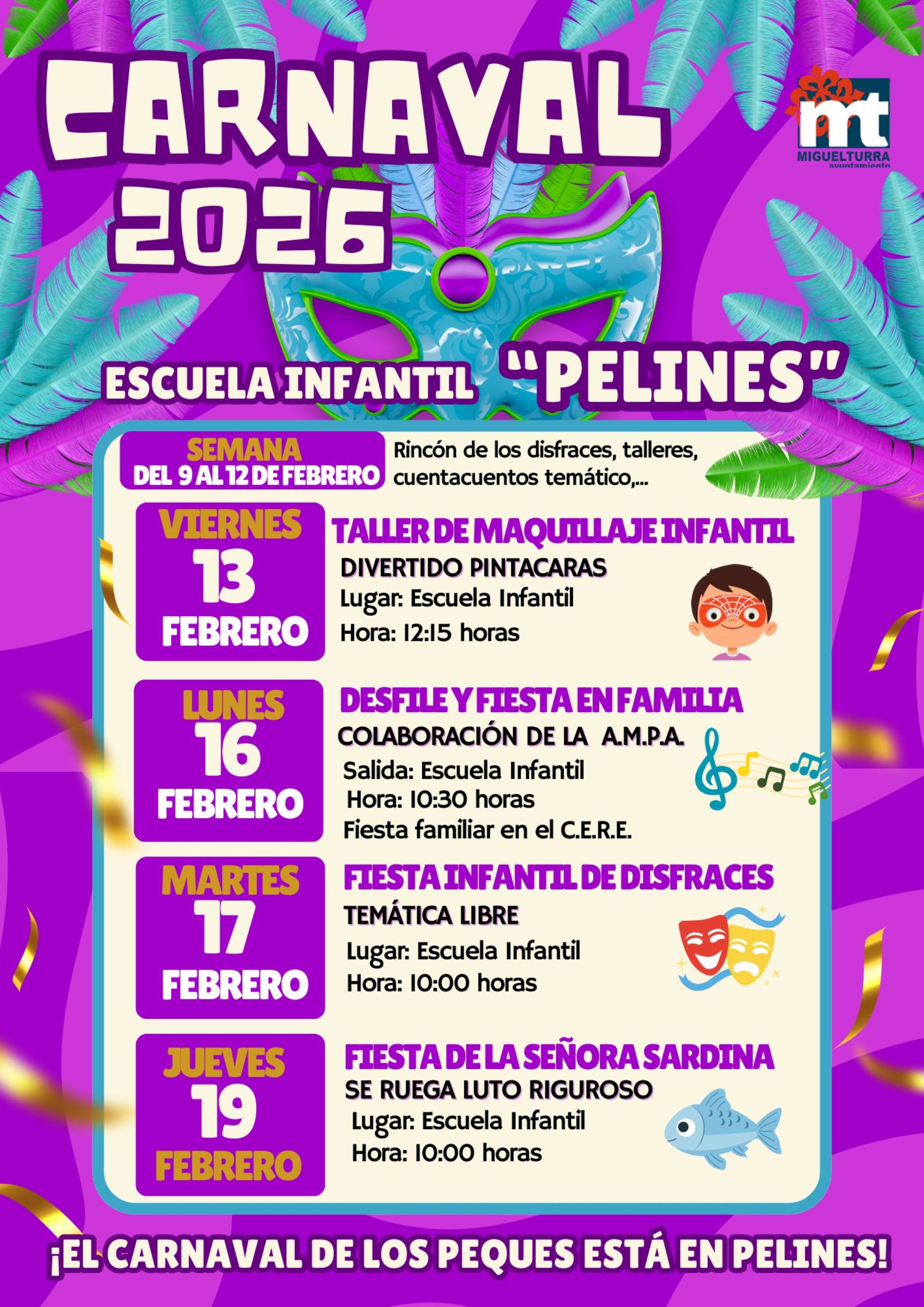 La dirección de la Escuela Infantil Municipal “Pelines” informa que el pasado lunes 9 de febrero comenzó su programación especial de Carnaval 2026 para acercar una de las costumbres y tradiciones más arraigadas de la localidad a sus pequeños y pequeñas de 1 a 3 años, y lo hace como mejor sabe: Con interesantes y motivadoras propuestas de juego que invitan a descubrir la alegría y diversión de la festividad carnavalera.