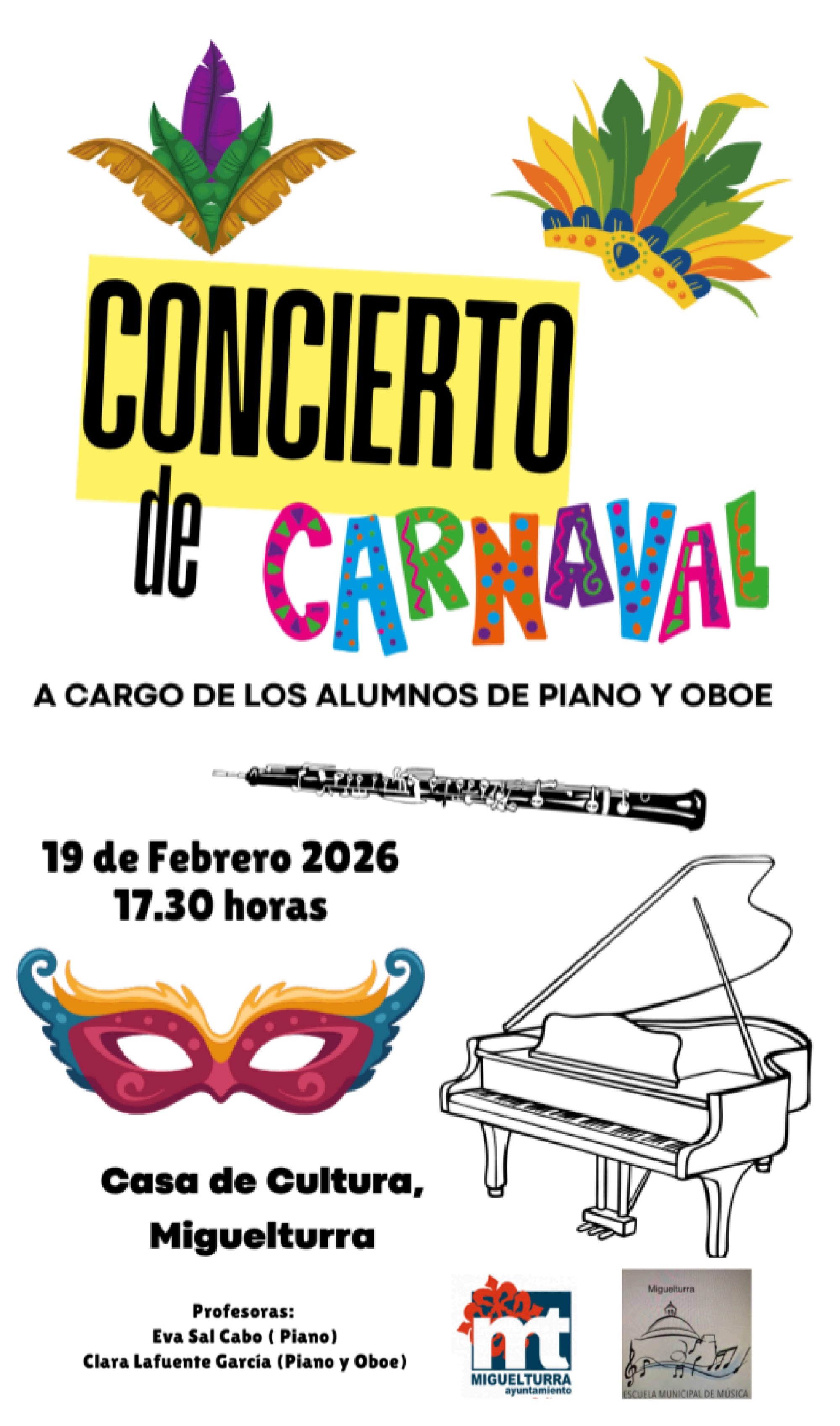 La Dirección de la Escuela Municipal de Música y Danza de Miguelturra, dependiente del área de Cultura, informa que esta tarde del jueves 19 de febrero de 2026 a las 17:30 horas en la Casa de la Cultura se llevará a cabo un especial “Concierto de Carnaval” a cargo del alumnado de piano y oboe de la Escuela, acompañados de sus profesoras Eva Sal Cabo y Clara Lafuente García, que llevan varias semanas practicando y ensayando con el alumnado los temas que van a interpretar.