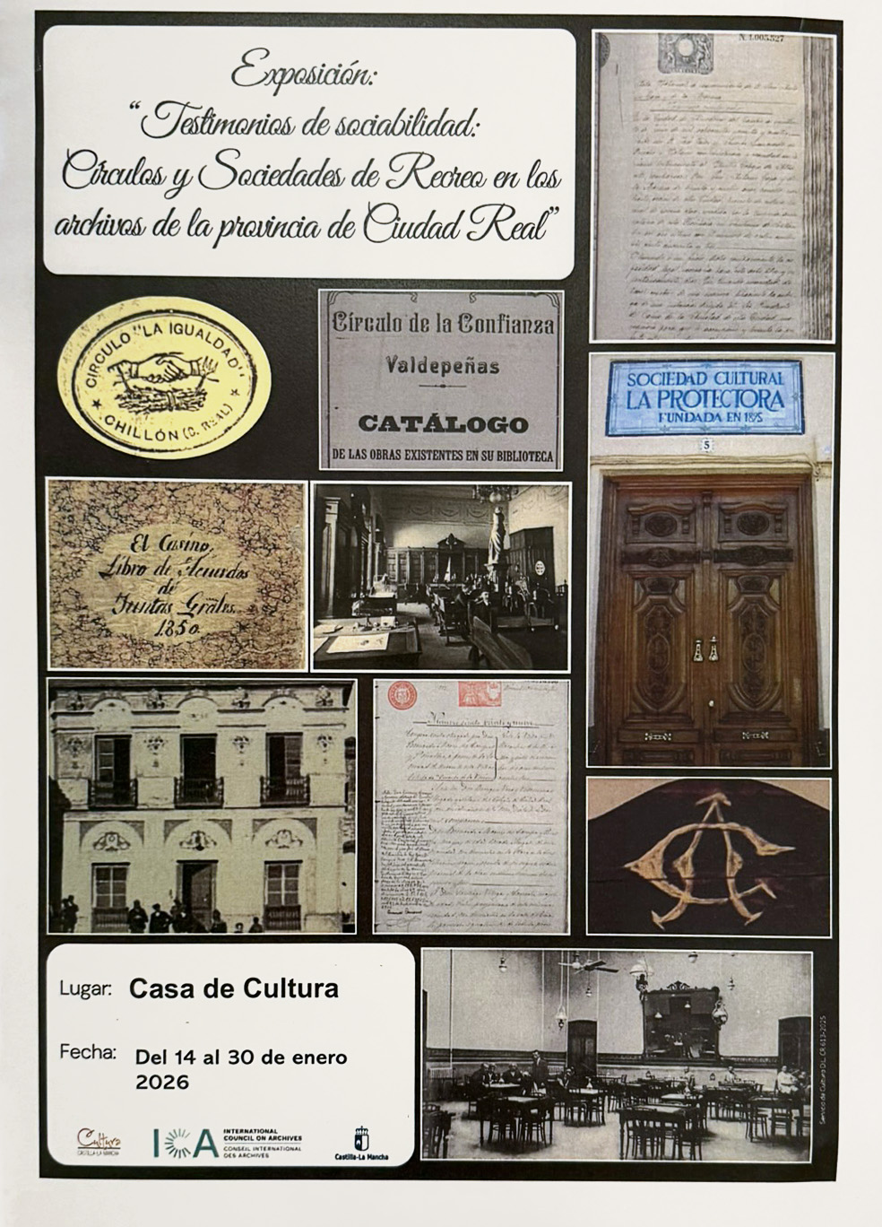 La Casa de Cultura alberga desde el pasado 14 de enero la exposición itinerante "Testimonios de sociabilidad: Círculos y Sociedades de Recreo en los archivos de la provincia de Ciudad Real". Organizada por el Servicio de Cultura de la Delegación Provincial de Ciudad Real en el marco del Día Internacional de los Archivos, la muestra ofrece una radiografía histórica de cómo se divertían, se asociaban y se relacionaban los vecinos de la provincia durante el siglo XIX y XX.