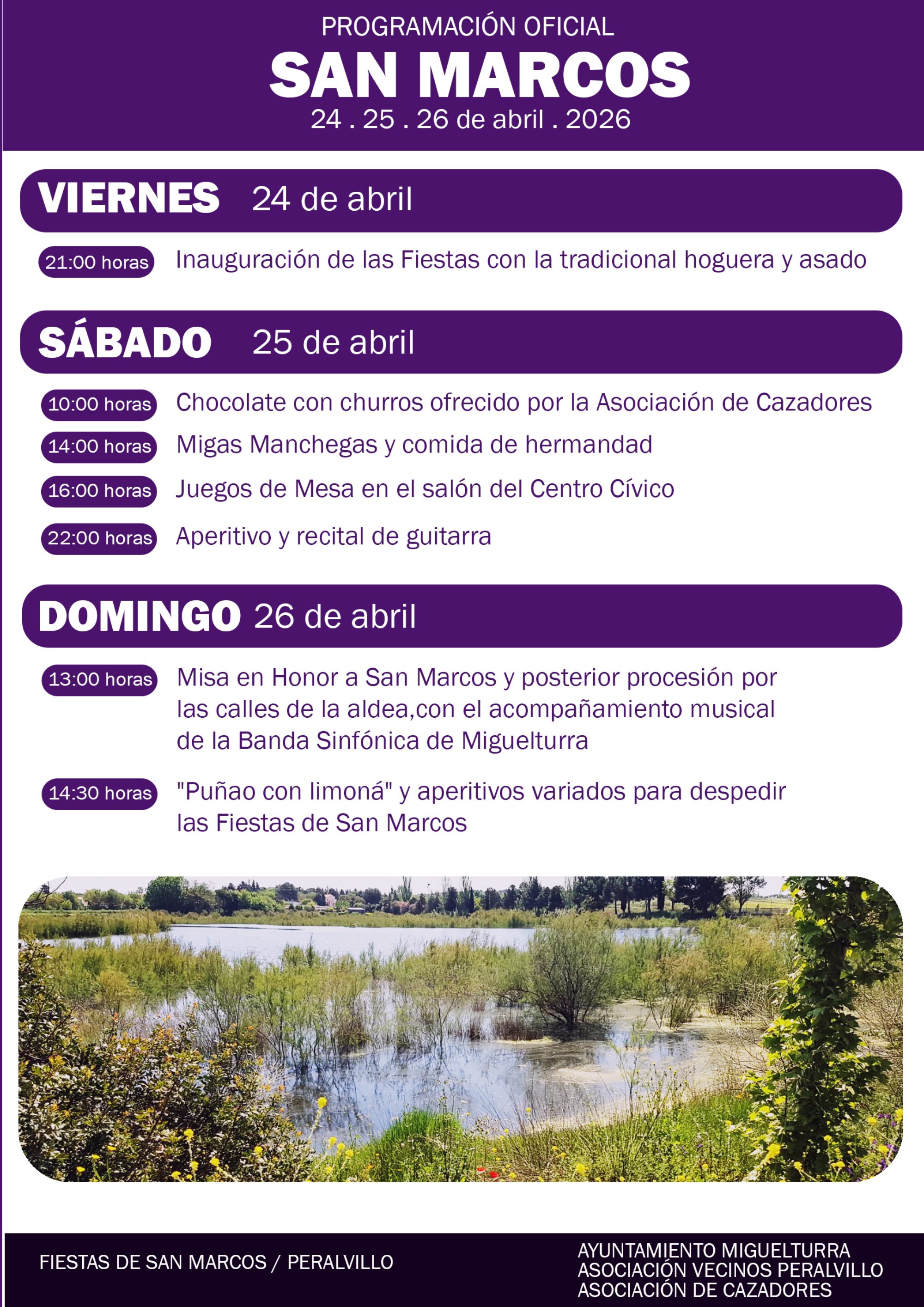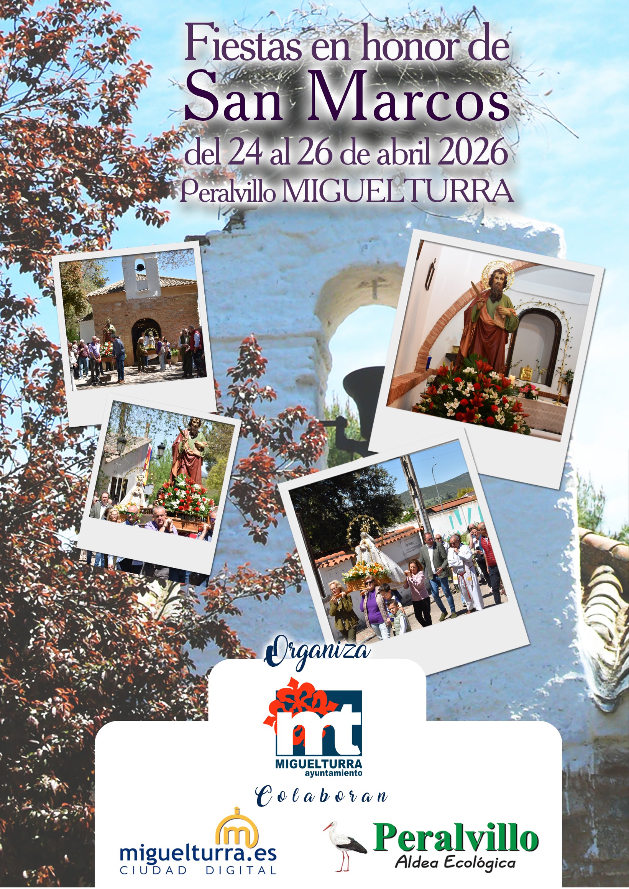 La pedanía de Peralvillo, en Miguelturra, celebrará sus tradicionales fiestas en honor a San Marcos del 24 al 26 de abril de 2026, evento organizado por el Ayuntamiento de Miguelturra y la Asociación Vecinal de Peralvillo con la colaboración de la Asociación de Cazadores.