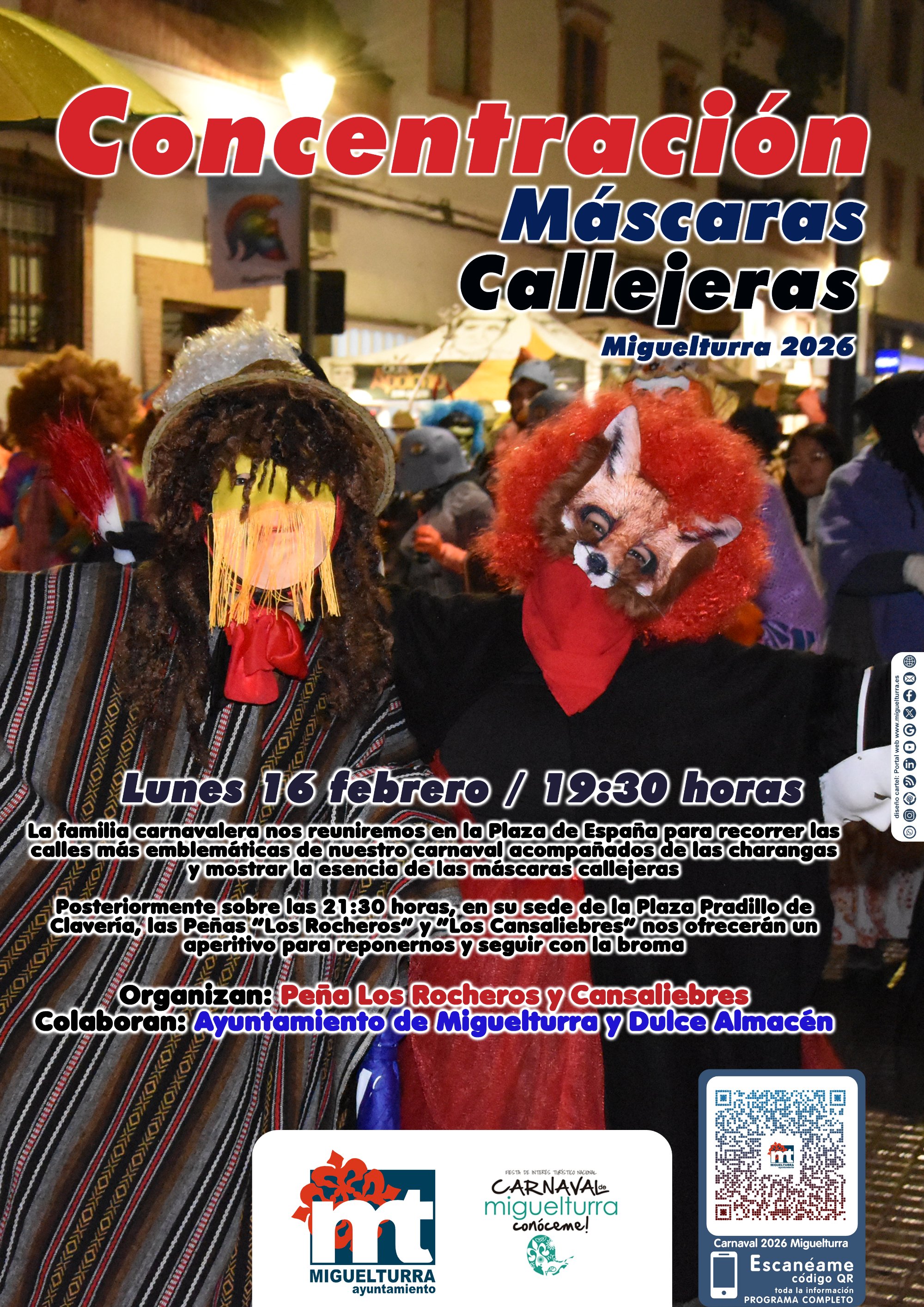 La familia carnavalera nos reuniremos en la Plaza de España para recorrer las calles más emblemáticas de nuestro carnaval acompañados de las charangas y mostrar la esencia de las máscaras callejeras, el lunes 16 de febrero de 2026 a partir de las 19:30 horas, que dará comienzo una nueva edición de la Concentración de Máscaras Callejeras.