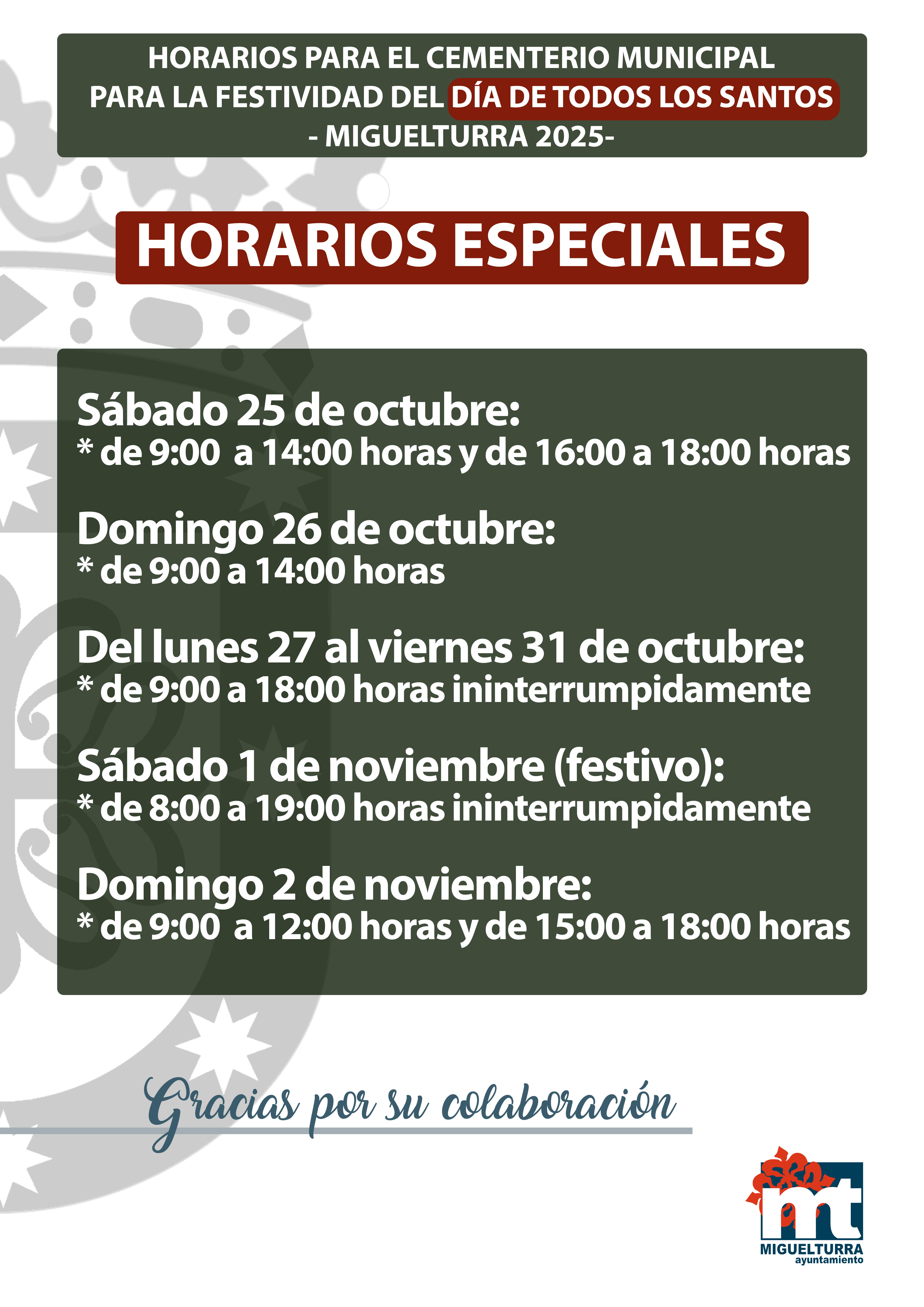 El Ayuntamiento de Miguelturra, a través del área de Servicios Generales, informa sobre los horarios especiales que tendrá el Cementerio Municipal durante la festividad de Todos los Santos en este año del 2025, a saber: