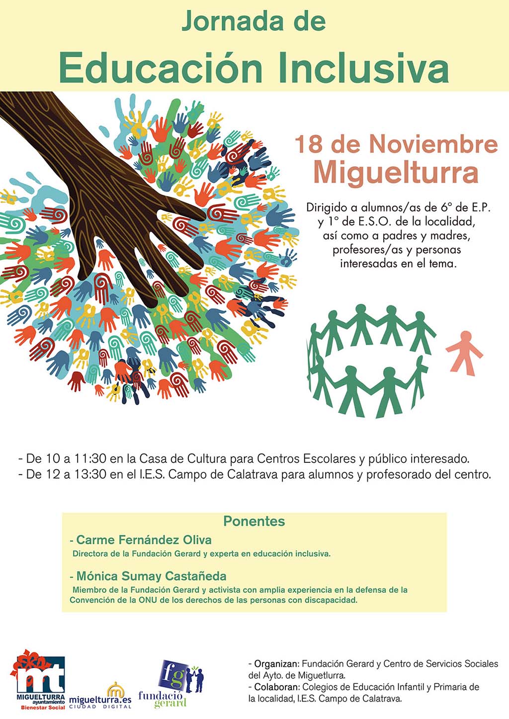 El Ayuntamiento de Miguelturra, a través del área de Servicios Sociales, y Fundación Gerard, organizan una Jornada de "Educación Inclusiva" en colaboración con los centros educativos de la localidad de educación infantil y primaria, además del Instituto de Enseñanza Secundaria Campo de Calatrava, el viernes 18 de noviembre de 2016.