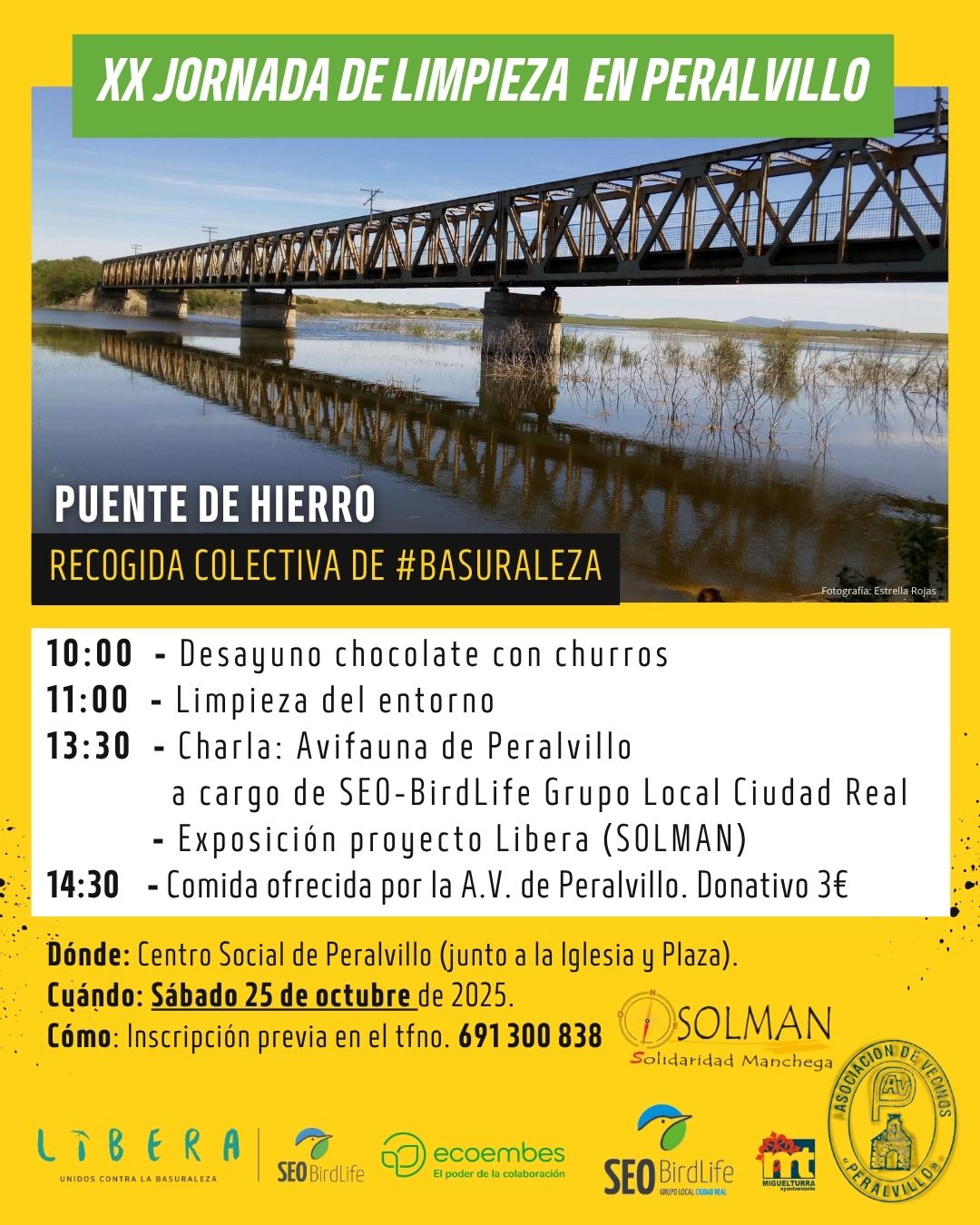 La jornada comenzará en el centro social de Peralvillo, frente a la iglesia, a las 10 de la mañana con un rico chocolate con churros, comenzando los trabajos a las 11 de la mañana, dividiéndose las personas participantes en grupos y zonas; ya, a las 13:30 horas, se desarrollará una charla a cargo de SEO-Birdlife Grupo Local de Ciudad Real sobre la avifauna de Peralvillo, además de una exposición del proyecto Libera de Solman, y para cerrar la jornada se ofrecerá una comida organizada por la Asociación de Vecinos de Peralvillo con donativo de 3 euros.