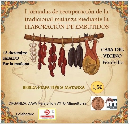 La Asociación de Vecinos de Peralvillo y el Ayuntamiento de Miguelturra, en colaboración con la empresa de productos cárnicos Framarco, organizan el sábado 13 de diciembre en horario de mañana la primera edición de la Jornada de recuperación de la tradicional matanza mediante elaboración de embutidos en Peralvillo.