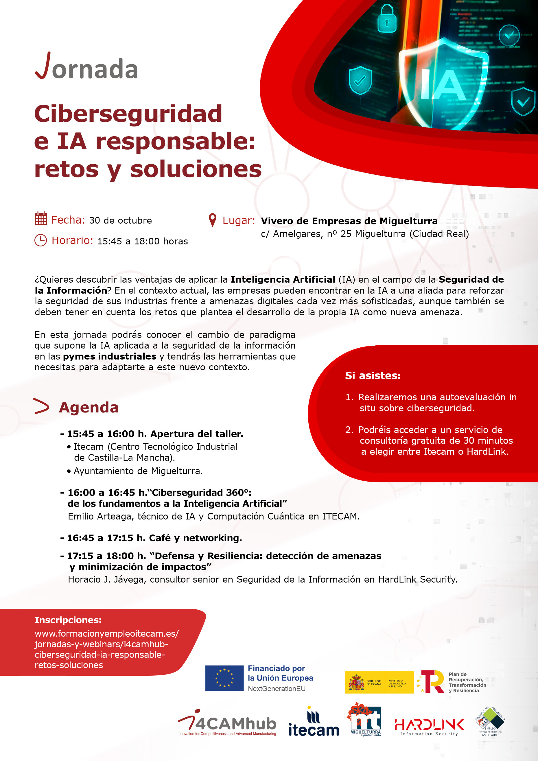 El Ayuntamiento de Miguelturra informa sobre el evento que desarrollará el Centro Tecnológico Industrial de Castilla-La Mancha (Itecam), la jornada “Ciberseguridad e Inteligencia Artificial responsable: retos y soluciones”, un encuentro formativo que tendrá lugar el miércoles 30 de octubre de 2025, de 15:45 a 18:00 horas, en el Vivero de Empresas de Miguelturra, situado en la calle Amelgares número 25.