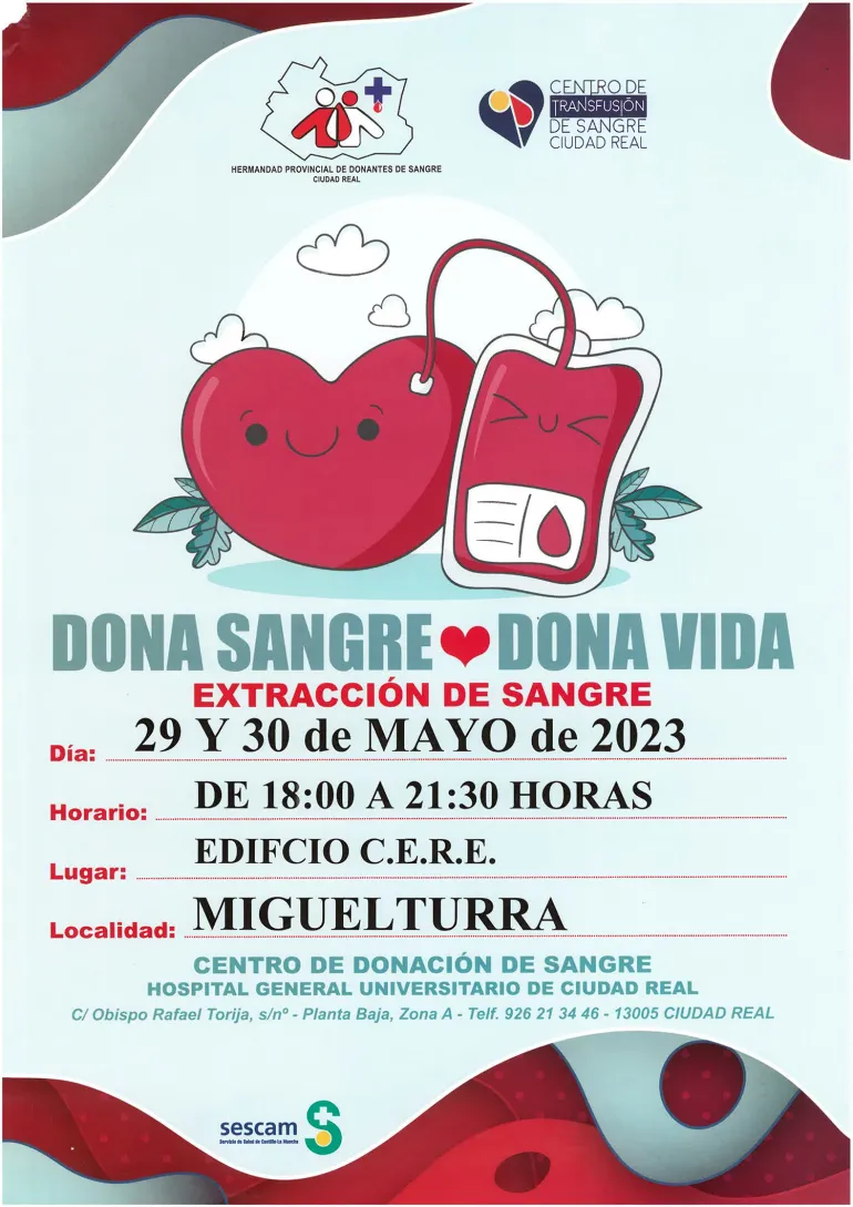 La Hermandad Provincial de Donantes de Sangre de Ciudad Real ha programado unas jornadas de extracción en Miguelturra que tendrán lugar los días 29 y 30 de mayo de 2023, lunes y martes respectivamente, en el Centro de Exposiciones y Representaciones Escénicas, CERE, ubicado en el parque Doctor Fleming.