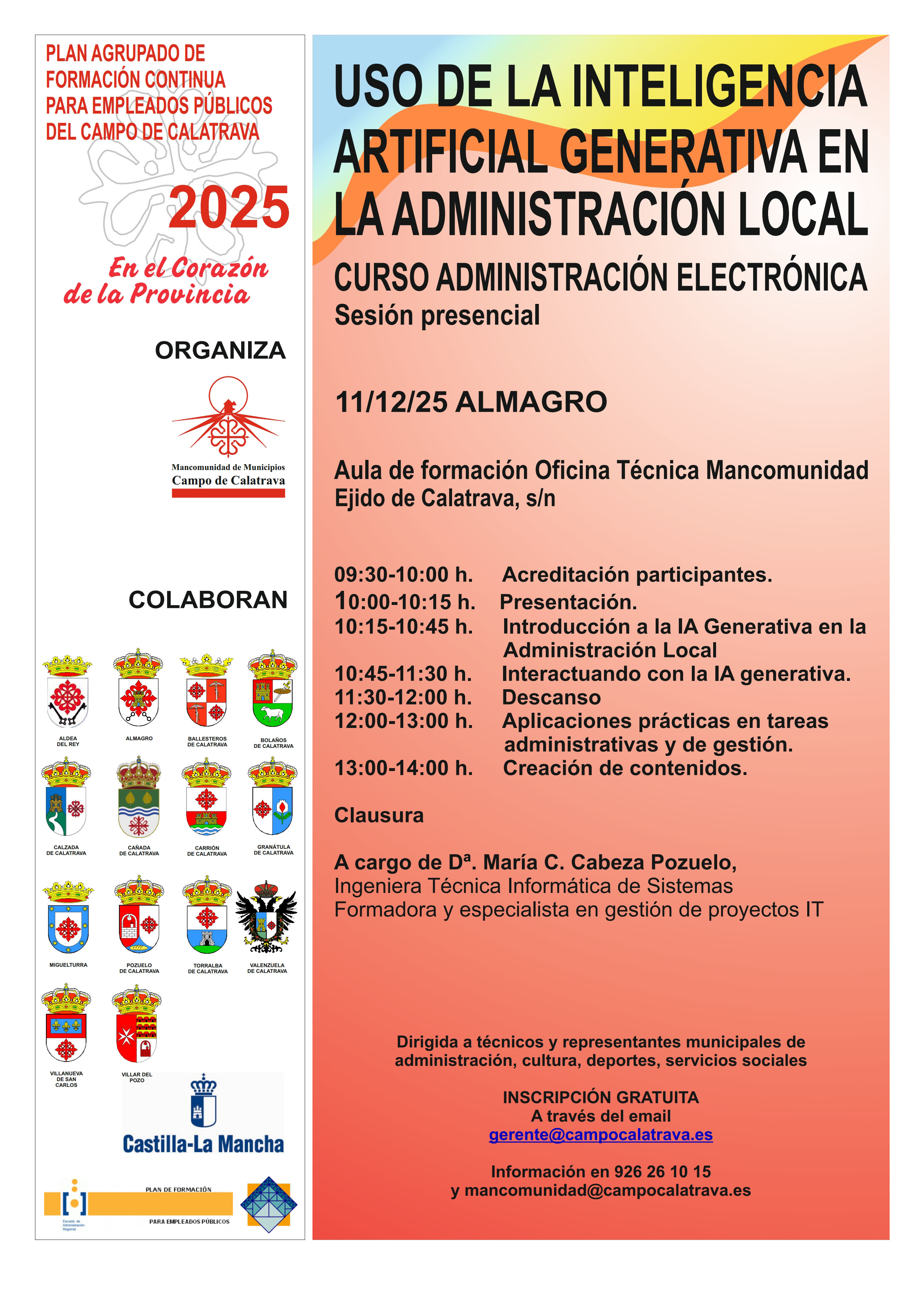 El curso se realizará el 11 de diciembre de 2025 en el aula de formación de la oficina de la Mancomunidad, sita en calle Ejido de Calatrava sin número; con ello se pretende contribuir a la mejora de la calidad de los servicios públicos del territorio, con la capacitación de los empleados de las entidades locales del territorio en nuevos procesos de gestión, apoyados por la inteligencia artificial.