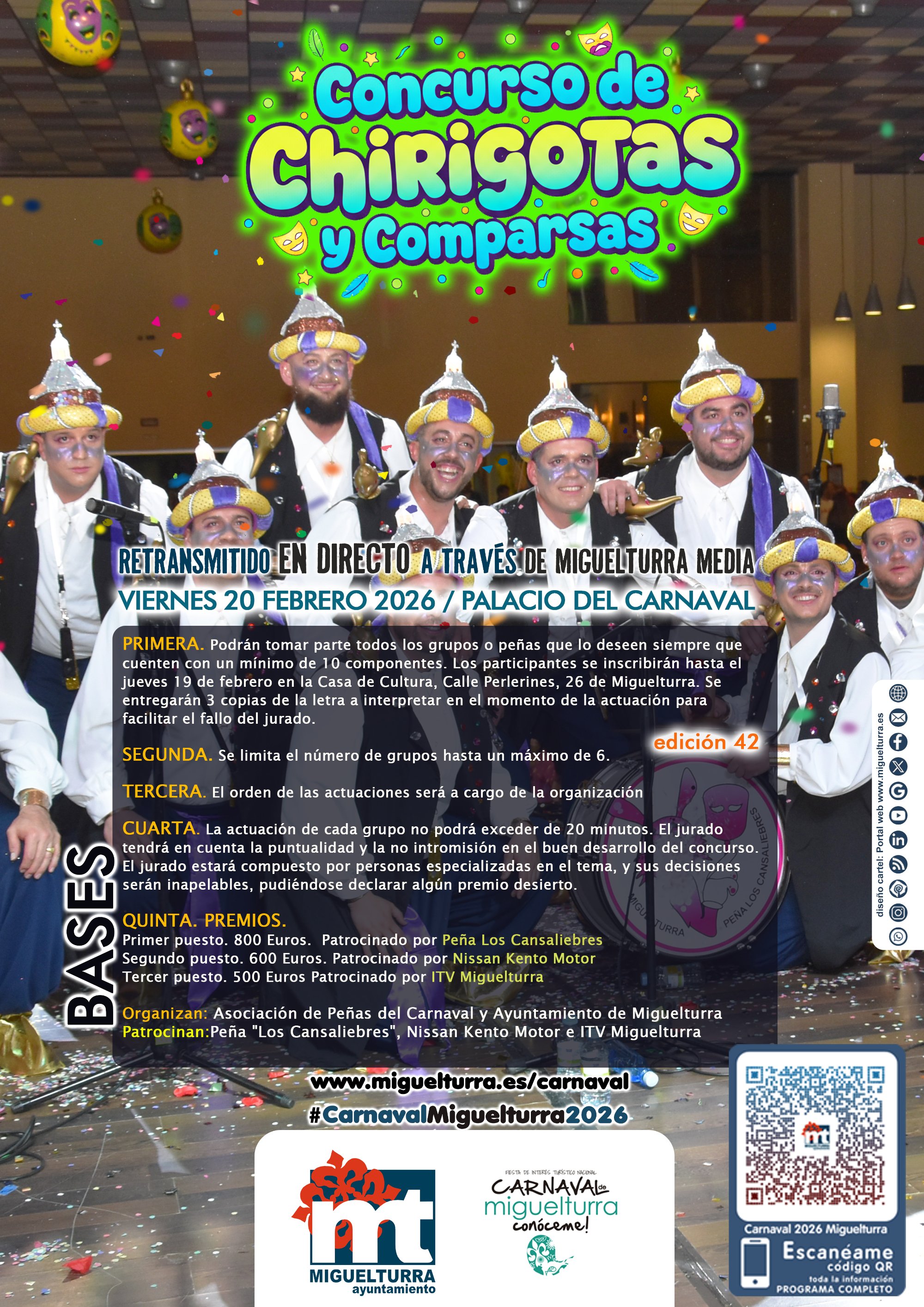 El certamen tendrá lugar el próximo viernes 20 de febrero de 2026 en el Palacio del Carnaval. Con el objetivo de que nadie se pierda el ingenio y la música de los grupos participantes, el evento será retransmitido íntegramente en directo a través de Miguelturra MEDIA.
