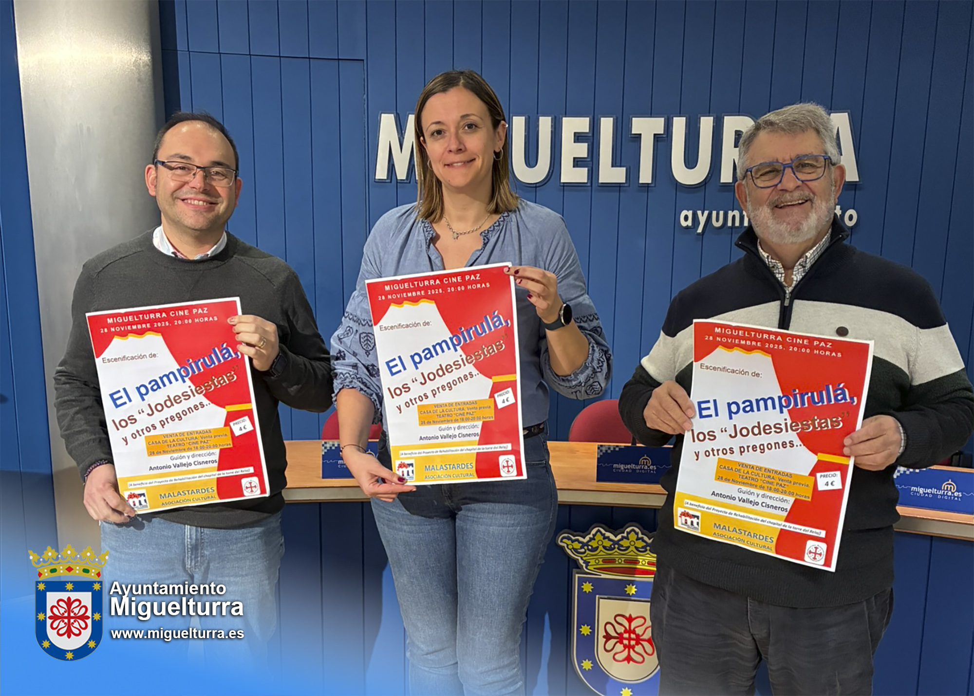 El Teatro Cine-Paz de Miguelturra acogerá este viernes, 28 de noviembre, a las 20:00 horas, la representación de "El pampirulá, los jodesiestas y otros pregones populares". Se trata de una evolución, en formato "2.0", de la exitosa iniciativa de los "Pregones Cantados" que la Asociación Cultural Malastardes estrenó en 2022. Las entradas, a 4 euros, están a la venta en las oficinas de la Casa de la Cultura o el mismo día de la obra en taquilla a partir de las 6 de la tarde.