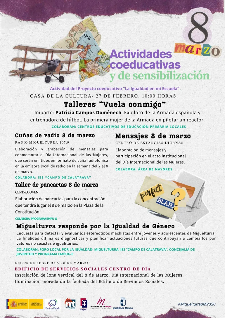La programación, presentada por la técnica responsable del Área, Rosa Montes, arranca con una fuerte apuesta por la coeducación. El 27 de febrero, la Casa de la Cultura acogerá el taller "Vuela conmigo", impartido por Patricia Campos Domenech, expiloto de la Armada Española (primera mujer en pilotar un reactor) y entrenadora de fútbol, quien compartirá su experiencia con el alumnado de primaria para romper techos de cristal desde la infancia.