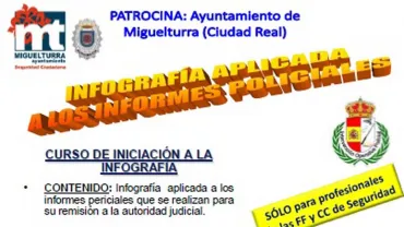 Cursos Convocatoria de un curso de iniciación a la infografía para los Cuerpos de Seguridad del Estado. Patrocinada por el Ayuntamiento de Miguelturra y que será impartido el 14 de junio.