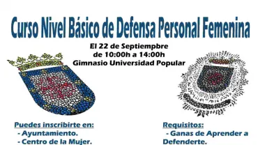 Cursos Abierto el plazo para participar en el curso gratuito de defensa personal para mujeres hasta el 19 de septiembre. Será impartido el sábado 22 de septiembre por la mañana por agentes de la policía local, expertos en defensa personal y artes marciales.