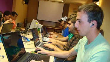 Cada jugador-a lleva su propio portátil y pasan la mañana compartiendo la afición por este juego shoot em up en primera persona. Imágenes del jueves y viernes.