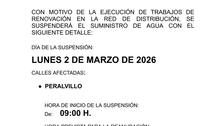 Urbanismo y Medio Ambiente Suspensión del suministro del agua en Peralvillo el 2 de marzo de 2026 por mejora de la red de distribución