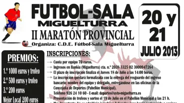Deportes Abierta la incripción para el Segundo Maratón Provincial de Fútbol Sala de Miguelturra. El plazo de inscripción termina el jueves 18 de julio.