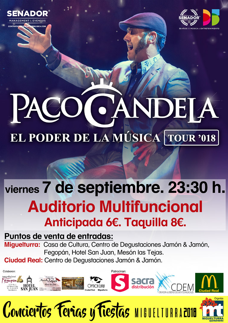 Dentro de la programación de las Ferias y Fiestas de Miguelturra en honor a la Virgen de la Estrella, patrona de la localidad, podremos disfrutar del concierto del cantaor Paco Candela dentro del tour 2018 "El poder de la música" en el Auditorio Multifuncional el viernes 7 de septiembre a partir de las 23:30 horas, concierto organizado por el Ayuntamiento de Miguelturra, en colaboración y patrocinio con diversas casas comerciales.