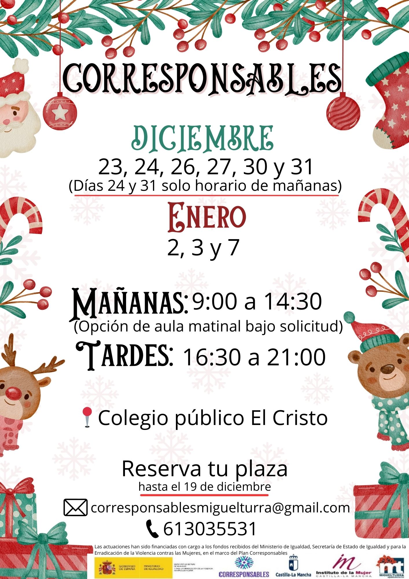 En cuanto a la reserva de plaza, Rosa Marina Caraballo ha informado que se puede formalizar hasta el 19 de diciembre. Las solicitudes deben realizarse a través del correo electrónico corresponsablesmiguelturra@gmail.com, o a través del teléfono 613 03 55 31. Aquellas personas que lo deseen también pueden dirigirse al Centro de la Mujer, donde se les derivará al servicio del Plan Corresponsables.