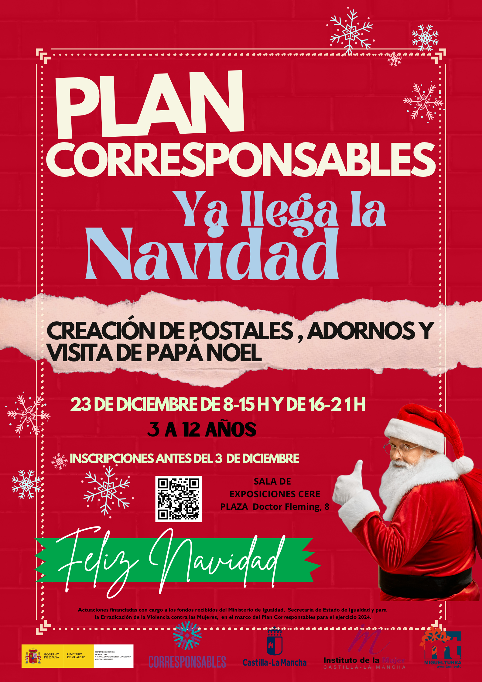 Dentro de la Programación de Navidad del Ayuntamiento de Miguelturra para este año 2025, el área de Igualdad ha programado una nueva actividad del Plan Corresponsables, en la Sala de Exposiciones del CERE, el martes 23 de diciembre llamada "Ya llega la Navidad", para niños y niñas de 3 a 12 años de 8:00 a 15:00 y de 16:00 a 21:00 horas, donde participarán en numerosos talleres, creación de postales, adornos y juegos relacionados con la Navidad, con la especial visita de Papá Nöel.