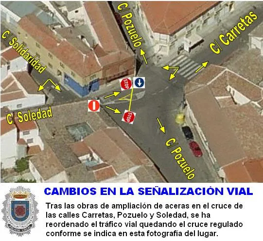 Con motivo de la ampliación de aceras de la calle Pozuelo, en su cruce con las calles Soledad, Solidaridad y Carretas, se ha dispuesto la nueva ordenación del tráfico, quedando de la siguiente forma: