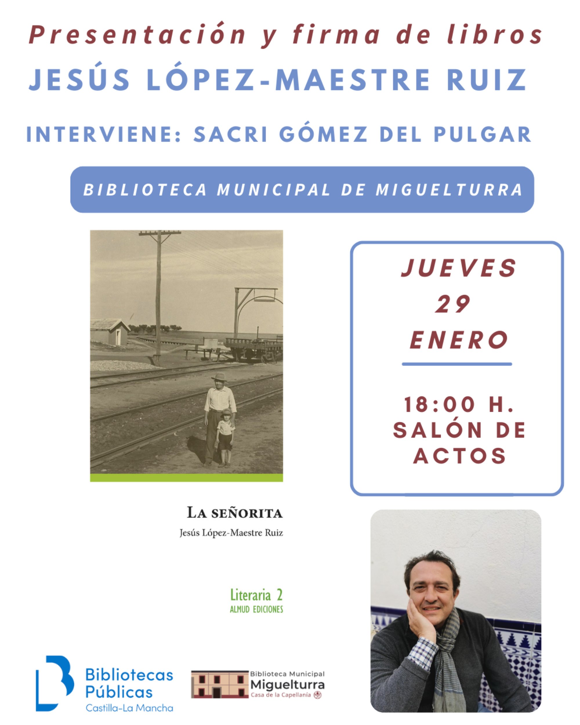 El área de Cultura del Ayuntamiento de Miguelturra informa que el jueves 29 de enero de 2026 se llevará a cabo en el salón de actos de la Biblioteca Pública Municipal “Casa de la Capellanía” la presentación y firma de libros con el escritor Jesús López-Maestre Ruiz a las 6 de la tarde.