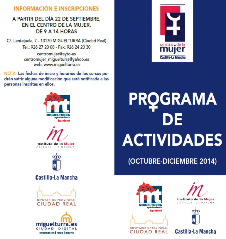 El plazo de matriculación e inscripciones es a partir del 22 de septiembre de 9:00 a 14:00 horas, el número de teléfono es 926272008 y el correo electrónico es centrodelamujer@ayto-miguelturra.es.