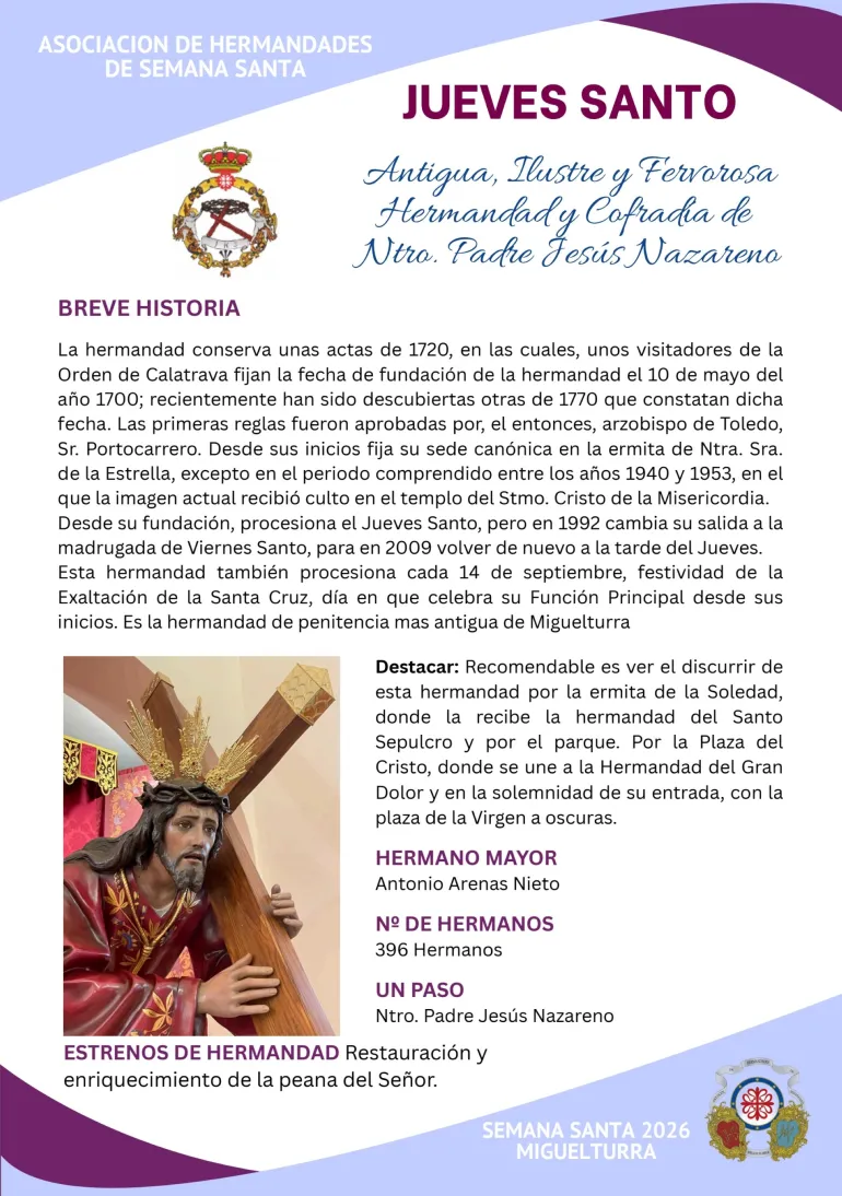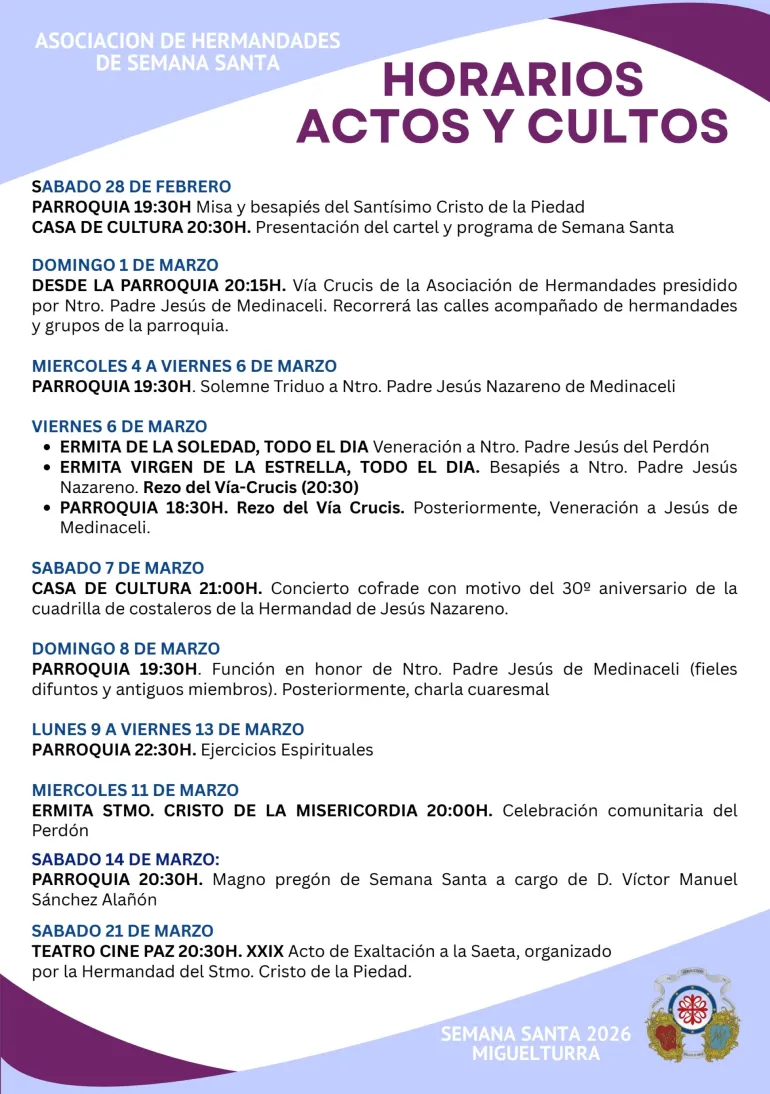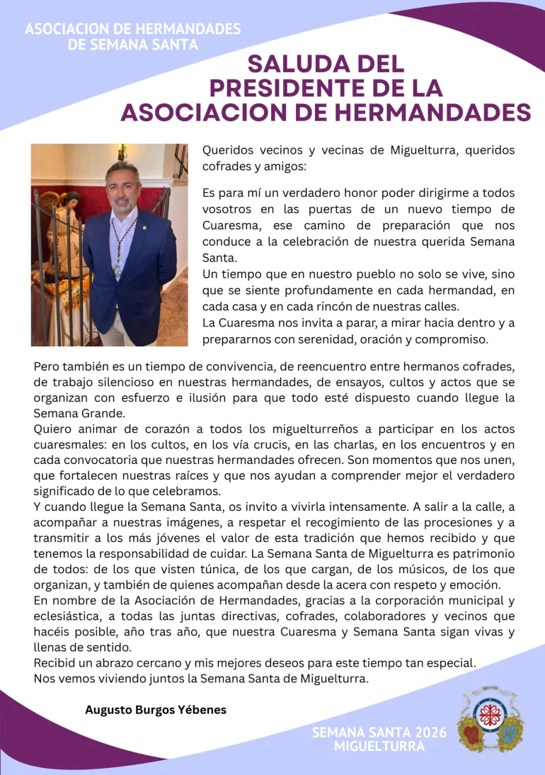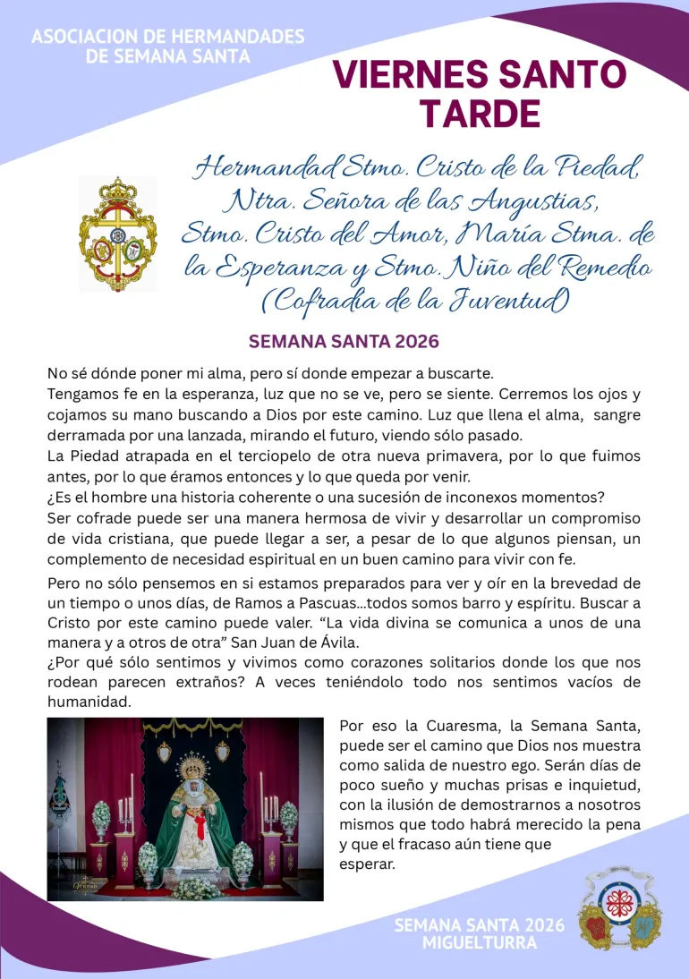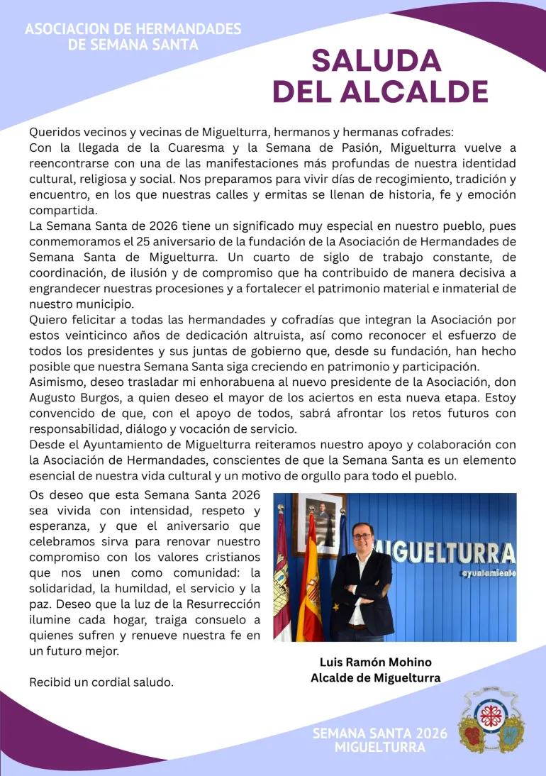 A continuación les dejamos a su disposición el programa completo correspondiente a la Semana Santa de Miguelturra 2026, tanto en imágenes como el documento en formato PDF, esperando sea de su interés, y cuyos actos principales se desarrollarán del viernes 27 de marzo al domingo 5 abril de 2026.
