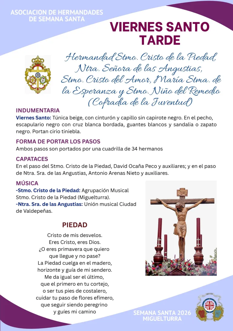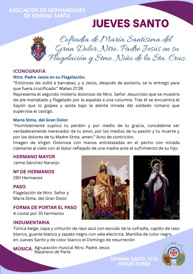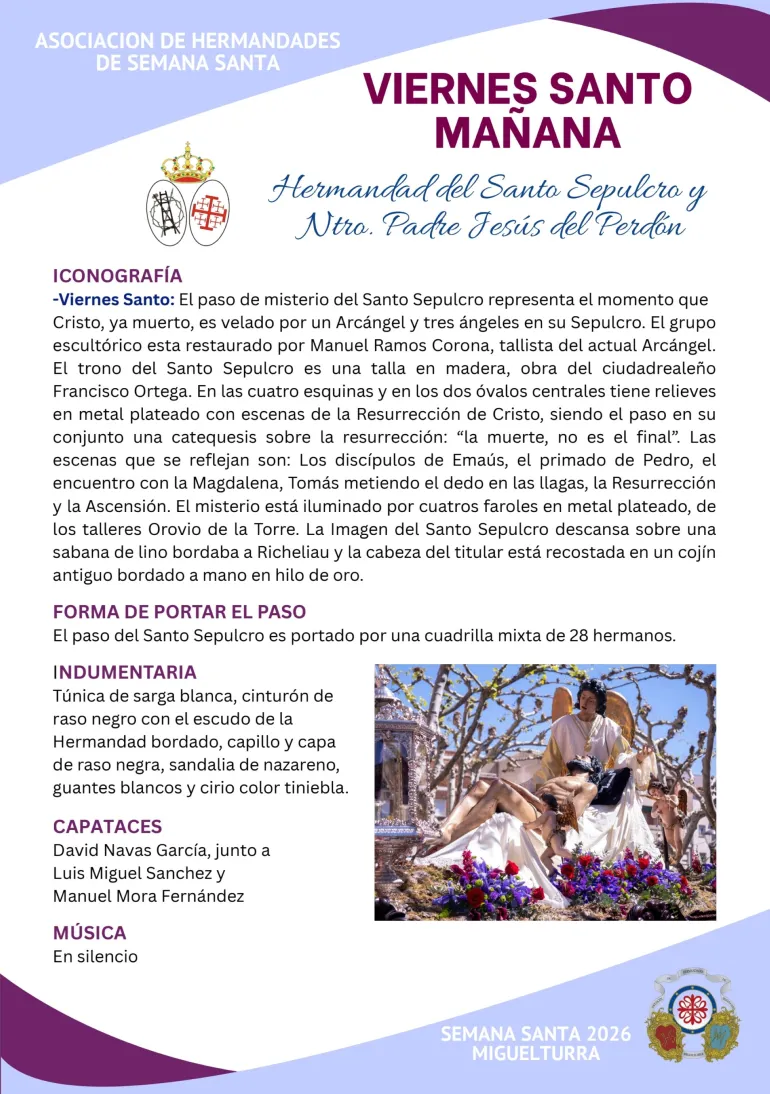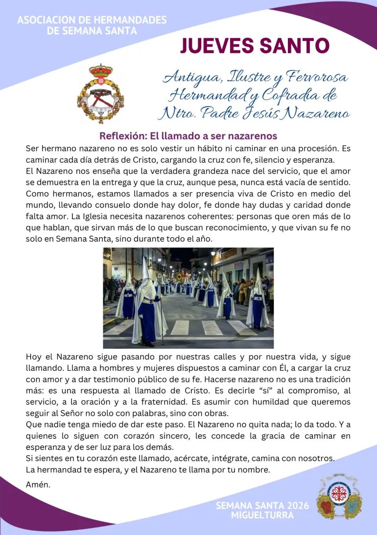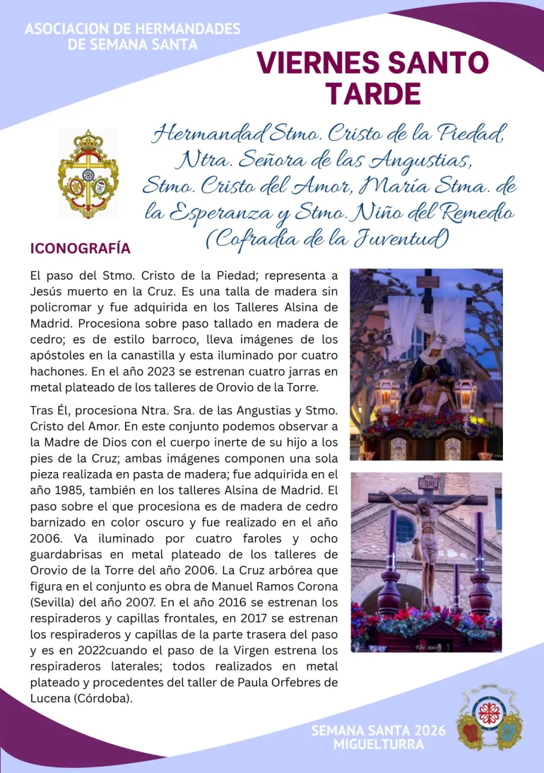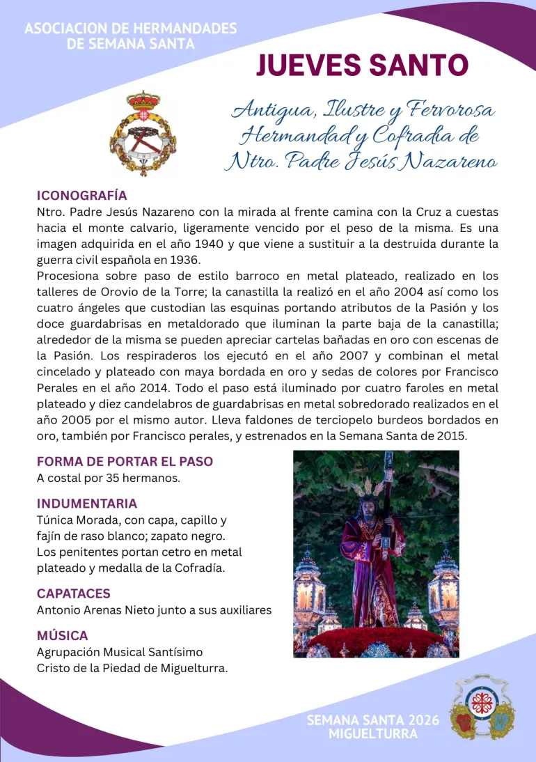 A continuación les dejamos a su disposición el programa completo correspondiente a la Semana Santa de Miguelturra 2026, tanto en imágenes como el documento en formato PDF, esperando sea de su interés, y cuyos actos principales se desarrollarán del viernes 27 de marzo al domingo 5 abril de 2026.